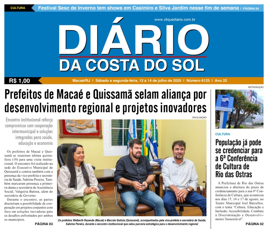 Edições Impressas Edição de sábado a segunda-feira 12 a 14/07/2025 nº 6123 Publicado em 12/07/2025 - 09:04 Escrito por Redação Notícias relacionadas: Seguinte Edição de terça-feira 15/07/2025 nº 6124 Anterior Edição de sexta-feira 11/07/2025 nº 6122 Redação Notícias Recentes Cidades13 horas atrás Macaé realizou 5ª Corrida e Caminhada Outubro Rosa Novembro Azul na orla da Imbetiba Cidades14 horas atrás Rio das Ostras autua Rio+ por mais um caso de vazamento de esgoto na cidade Cabo Frio14 horas atrás Ação da Prefeitura e AAMA leva reflexão sobre autocuidado e prevenção do câncer de mama em Cabo Frio Cidades14 horas atrás Casa do Servidor em Macaé ultrapassa 7 mil atendimentos em oito meses de funcionamento Polícia14 horas atrás Foragido da Justiça é preso pela PM na BR-101 em Campos Araruama14 horas atrás Prefeitura define plano de segurança integrado para a Expo Araruama Iguaba14 horas atrás Prefeitura de Iguaba Grande prepara nova turma de aprendizes para atuação em órgãos públicos Cabo Frio14 horas atrás Mostra de Dança movimenta Cabo Frio com apresentações, solidariedade e cultura local Cabo Frio14 horas atrás Cabo Frio dá início à formação obrigatória para ambulantes das praias Polícia15 horas atrás Homem é preso com rádios transmissores em depósito de Casimiro de Abreu Clique Diário E. L. Mídia Editora Ltda CNPJ: 09.298.880/0001-07 Redação: Rua Tupinambás 122 Gloria – Macaé/RJ comercial@diariocs.com (22) 2765-7353 (22) 999253130 Mais lidas da semana Cultura7 dias atrás Música, emoção e cores: Rodrigo Pontes apresenta show especial em Rio das Ostras Edições Impressas6 dias atrás Edição de quarta-feira 22/10/2025 nº 6195 Edições Impressas5 dias atrás Edição de quinta-feira 23/10/2025 nº 6196 Cidadania4 dias atrás Plano Diretor de Rio das Ostras é tema de fórum da sociedade civil nesse sábado, 25