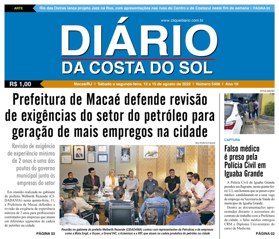 Edições Impressas Edição de sábado a segunda-feira 13 a 15/08/2022 nº 5406 Publicado em 12/08/2022 - 23:55 Escrito por Fernando Vitor Notícias relacionadas: Seguinte Edição de terça-feira 16/08/2022 nº 5407 Anterior Edição de sexta-feira 12/08/2022 nº 5405 Fernando Vitor Notícias Recentes Cultura34 minutos atrás Moda e Prosa Caipira tem sua 6ª edição nessa quinta, 20, em Saquarema Comércio2 horas atrás Rio das Ostras tem 19ª edição de sua tradicional feira outlet nesse feriado Cidades2 horas atrás Macaé recebe 20ª edição do Prefeitura Presente no dia 25 de novembro Polícia3 horas atrás Denúncia anônima leva à prisão de duas mulheres por tráfico em Macaé Cidades3 horas atrás Caravana de Natal Coca-Cola passa por Rio das Ostras e Casimiro de Abreu nessa quinta, 20 Edições Impressas5 horas atrás Edição de quarta-feira 19/11/2025 nº 6215 Arraial do cabo20 horas atrás Educação de Arraial do Cabo orienta responsáveis sobre rematrícula para o próximo ano Cabo Frio20 horas atrás Evento comercial mais aguardado de Cabo Frio atinge 100% de estandes vendidos Saúde21 horas atrás Rio das Ostras comemora melhorias no atendimento da saúde municipal Cabo Frio21 horas atrás Nova exposição no Palácio das Águias recebe homenagem da cultura negra em Cabo Frio com 44 obras Clique Diário E. L. Mídia Editora Ltda CNPJ: 09.298.880/0001-07 Redação: Rua Tupinambás 122 Gloria – Macaé/RJ comercial@diariocs.com (22) 2765-7353 (22) 999253130 Mais lidas da semana Cultura5 dias atrás Adilson Lopes apresenta exposição “Trajetória” em Casimiro de Abreu Cidades6 dias atrás Macaé é finalista no Festival Internacional de Cinema Cristão com “A Paixão de Cristo” Meio Ambiente2 dias atrás Lagoa de Iriry, em Rio das Ostras, recebe nova sinalização focada em sustentabilidade Cidades2 dias atrás Macaé registra avanço na coleta seletiva porta a porta e recolhe mais de 2 toneladas em 45 dias