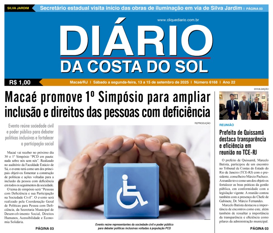 Edições Impressas Edição de sábado a segunda-feira 13 a 15/09/2025 nº 6168 Publicado em 13/09/2025 - 09:31 Escrito por Redação Notícias relacionadas: Seguinte Edição de terça-feira 16/09/2025 nº 6169 Anterior Edição de sexta-feira 12/09/2025 nº 6167 Redação Notícias Recentes Cabo Frio2 horas atrás Estudantes de Cabo Frio brilham em premiação do projeto CaptaAção Armação dos Búzios7 horas atrás Búzios Swim celebra esporte, natureza e turismo na Região dos Lagos Cabo Frio8 horas atrás Educação pública de Cabo Frio colhe frutos com conquistas em competições científicas Edições Impressas9 horas atrás Edição de sábado a segunda-feira 08 a 10/11/2025 nº 6208 Polícia9 horas atrás Moto sem placa é abandonada após fuga de suspeito em Macaé Polícia10 horas atrás Polícia Civil prende homem em flagrante por tráfico de drogas no Parque Aeroporto, em Macaé Iguaba1 dia atrás Menina de Iguaba Grande realiza sonho e conhece o príncipe William no Rio de Janeiro Arraial do cabo1 dia atrás Arraial do Cabo é exemplo de tranquilidade na Região dos Lagos, segundo dados do ISP Arraial do cabo1 dia atrás Festival em Arraial do Cabo promete recorde de público com mais de 15 mil pratos e 10 mil litros de chope Arraial do cabo1 dia atrás Oficina une saúde, cidadania e acolhimento em Arraial do Cabo Clique Diário E. L. Mídia Editora Ltda CNPJ: 09.298.880/0001-07 Redação: Rua Tupinambás 122 Gloria – Macaé/RJ comercial@diariocs.com (22) 2765-7353 (22) 999253130 Mais lidas da semana Arraial do cabo2 dias atrás Arraial do Cabo celebra 3ª edição do Festival de Frutos do Mar com entrada livre; Carol Biazin, Ramona Rox, Liah Soares e mais Turismo5 dias atrás Saquarema celebra reconhecimento de projeto pelo Ministério do Turismo Educação4 dias atrás Estudantes de Rio das Ostras são destaques em evento nacional da Educação Cidades4 dias atrás HFM ganha novo Pronto-Socorro moderno e ampliado em Campos