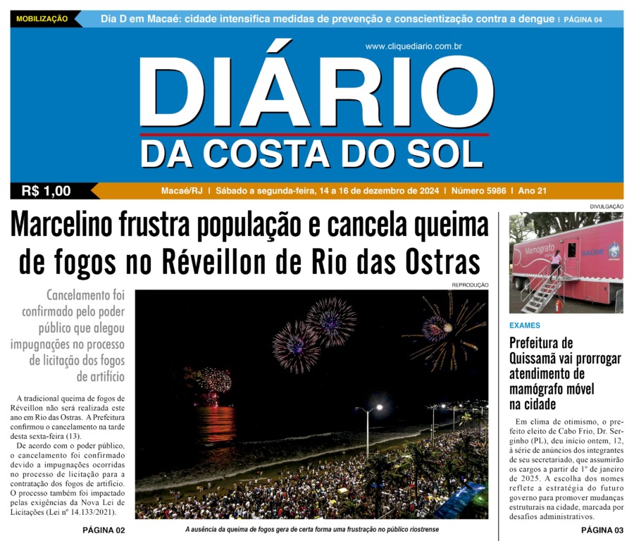 Edições Impressas Edição de sábado a segunda-feira 14 a 16/12/2024 nº 5986 Publicado em 14/12/2024 - 08:28 Escrito por Redação Notícias relacionadas: Seguinte Edição de terça-feira 17/12/2024 n° 5987 Anterior Edição de sexta-feira 13/12/2024 n° 5985 Redação Notícias Recentes Cabo Frio2 dias atrás Estudantes de Cabo Frio brilham em premiação do projeto CaptaAção Meio Ambiente2 dias atrás Cepro promove encontro para discutir avanços e desafios da justiça climática em Rio das Ostras Armação dos Búzios2 dias atrás Búzios Swim celebra esporte, natureza e turismo na Região dos Lagos Cabo Frio2 dias atrás Educação pública de Cabo Frio colhe frutos com conquistas em competições científicas Edições Impressas2 dias atrás Edição de sábado a segunda-feira 08 a 10/11/2025 nº 6208 Polícia2 dias atrás Moto sem placa é abandonada após fuga de suspeito em Macaé Polícia2 dias atrás Polícia Civil prende homem em flagrante por tráfico de drogas no Parque Aeroporto, em Macaé Iguaba3 dias atrás Menina de Iguaba Grande realiza sonho e conhece o príncipe William no Rio de Janeiro Arraial do cabo3 dias atrás Arraial do Cabo é exemplo de tranquilidade na Região dos Lagos, segundo dados do ISP Arraial do cabo3 dias atrás Festival em Arraial do Cabo promete recorde de público com mais de 15 mil pratos e 10 mil litros de chope Clique Diário E. L. Mídia Editora Ltda CNPJ: 09.298.880/0001-07 Redação: Rua Tupinambás 122 Gloria – Macaé/RJ comercial@diariocs.com (22) 2765-7353 (22) 999253130 Mais lidas da semana Arraial do cabo4 dias atrás Arraial do Cabo celebra 3ª edição do Festival de Frutos do Mar com entrada livre; Carol Biazin, Ramona Rox, Liah Soares e mais Meio Ambiente5 dias atrás Programa do governo estadual promove limpeza de rio no Âncora, em Rio das Ostras Meio Ambiente4 dias atrás Ações do Programa Limpa Rio seguem em vários pontos de Rio das Ostras Cidades6 dias atrás HFM ganha novo Pronto-Socorro moderno e ampliado em Campos
