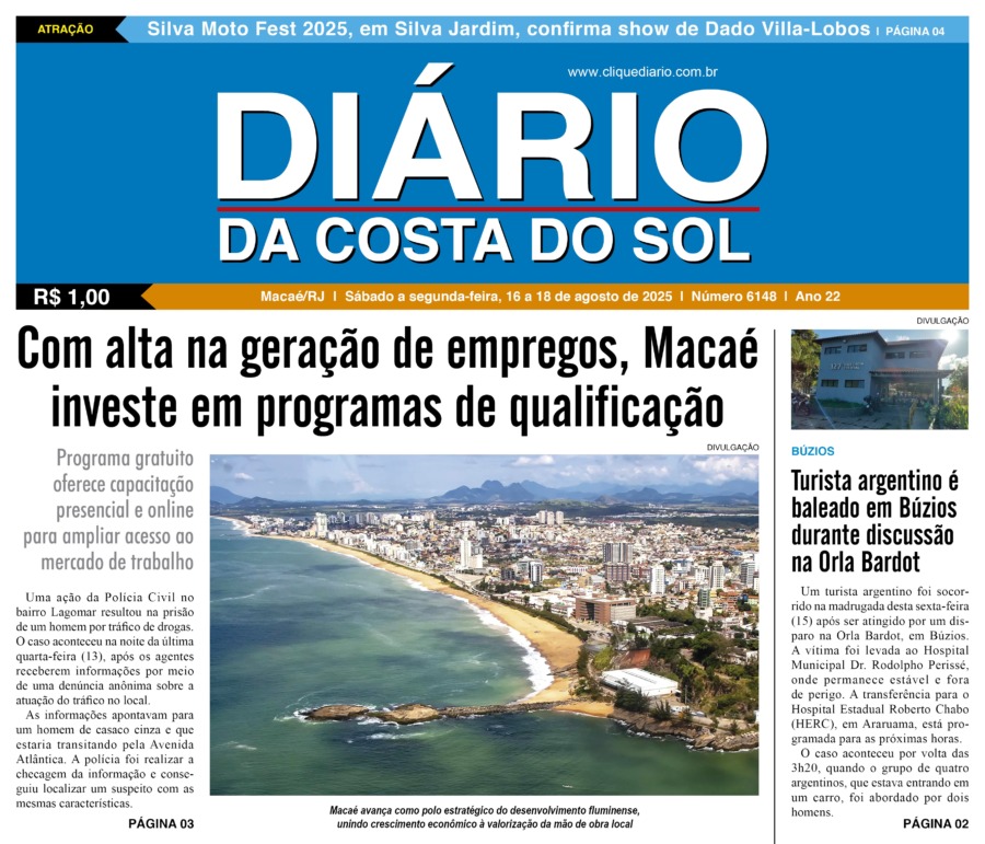 Edições Impressas Edição de sábado a segunda-feira 16 a 18/08/2025 nº 6148 Publicado em 16/08/2025 - 10:21 Escrito por Redação Notícias relacionadas: Seguinte Edição de terça-feira 19/08/2025 nº 6149 Anterior Edição de sexta-feira 15/08/2025 nº 6147 Redação Notícias Recentes Cabo Frio2 dias atrás Estudantes de Cabo Frio brilham em premiação do projeto CaptaAção Meio Ambiente2 dias atrás Cepro promove encontro para discutir avanços e desafios da justiça climática em Rio das Ostras Armação dos Búzios2 dias atrás Búzios Swim celebra esporte, natureza e turismo na Região dos Lagos Cabo Frio2 dias atrás Educação pública de Cabo Frio colhe frutos com conquistas em competições científicas Edições Impressas2 dias atrás Edição de sábado a segunda-feira 08 a 10/11/2025 nº 6208 Polícia2 dias atrás Moto sem placa é abandonada após fuga de suspeito em Macaé Polícia2 dias atrás Polícia Civil prende homem em flagrante por tráfico de drogas no Parque Aeroporto, em Macaé Iguaba3 dias atrás Menina de Iguaba Grande realiza sonho e conhece o príncipe William no Rio de Janeiro Arraial do cabo3 dias atrás Arraial do Cabo é exemplo de tranquilidade na Região dos Lagos, segundo dados do ISP Arraial do cabo3 dias atrás Festival em Arraial do Cabo promete recorde de público com mais de 15 mil pratos e 10 mil litros de chope Clique Diário E. L. Mídia Editora Ltda CNPJ: 09.298.880/0001-07 Redação: Rua Tupinambás 122 Gloria – Macaé/RJ comercial@diariocs.com (22) 2765-7353 (22) 999253130 Mais lidas da semana Arraial do cabo4 dias atrás Arraial do Cabo celebra 3ª edição do Festival de Frutos do Mar com entrada livre; Carol Biazin, Ramona Rox, Liah Soares e mais Meio Ambiente5 dias atrás Programa do governo estadual promove limpeza de rio no Âncora, em Rio das Ostras Meio Ambiente4 dias atrás Ações do Programa Limpa Rio seguem em vários pontos de Rio das Ostras Cidades6 dias atrás HFM ganha novo Pronto-Socorro moderno e ampliado em Campos