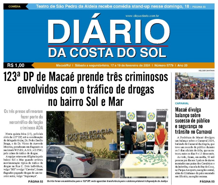 Edições Impressas Edição de sábado a segunda-feira 17 a 19/02/2024 nº 5779 Publicado em 17/02/2024 - 00:00 Escrito por Redação Notícias relacionadas: Seguinte Edição de terça-feira 20/02/2024 nº 5780 Anterior Edição de Sexta-feira 16/02/2024 nº 5778 Redação Notícias Recentes Cidades5 horas atrás Prefeitura de Macaé divulga 14º edital de convocação do Concurso Público 01/2024 Cidades5 horas atrás Casa do Servidor de Macaé ultrapassa 3 mil atendimentos em menos de um ano Cidades5 horas atrás Defesa Civil de Rio das Ostras participa de oficina sobre riscos geológicos Polícia5 horas atrás Denúncia de violência contra idosos leva à prisão de homem procurado por homicídio em Campos Cabo Frio6 horas atrás Empreendedores da cultura participam de formação gratuita em Cabo Frio Cabo Frio6 horas atrás ESF de CaboFrio realiza encontro de conscientização e ações no Outubro Rosa Cidades7 horas atrás Prefeitura encontra vazamento de esgoto em rede coletora da Rio+, em Rio das Ostras Arraial do cabo7 horas atrás Estruturas irregulares são retiradas durante operação conjunta na Praia do Forno em Arraial do Cabo Cabo Frio7 horas atrás Cabo Frio reforça ações contra ocupações em áreas protegidas Cabo Frio7 horas atrás Defesa Civil da Baixada Litorânea participa de capacitação em Cabo Frio Clique Diário E. L. Mídia Editora Ltda CNPJ: 09.298.880/0001-07 Redação: Rua Tupinambás 122 Gloria – Macaé/RJ comercial@diariocs.com (22) 2765-7353 (22) 999253130 Mais lidas da semana Edições Impressas6 dias atrás Edição de sexta-feira 17/10/2025 nº 6192 Cultura3 dias atrás Silva Jardim anuncia shows gratuitos de samba e pagode para o fim de semana Cabo Frio3 dias atrás Atletas de várias cidades se enfrentam em competição de Muay Thai em Cabo Frio Polícia3 dias atrás Policiais da PRF salvam bebê engasgado na BR-101, em Campos