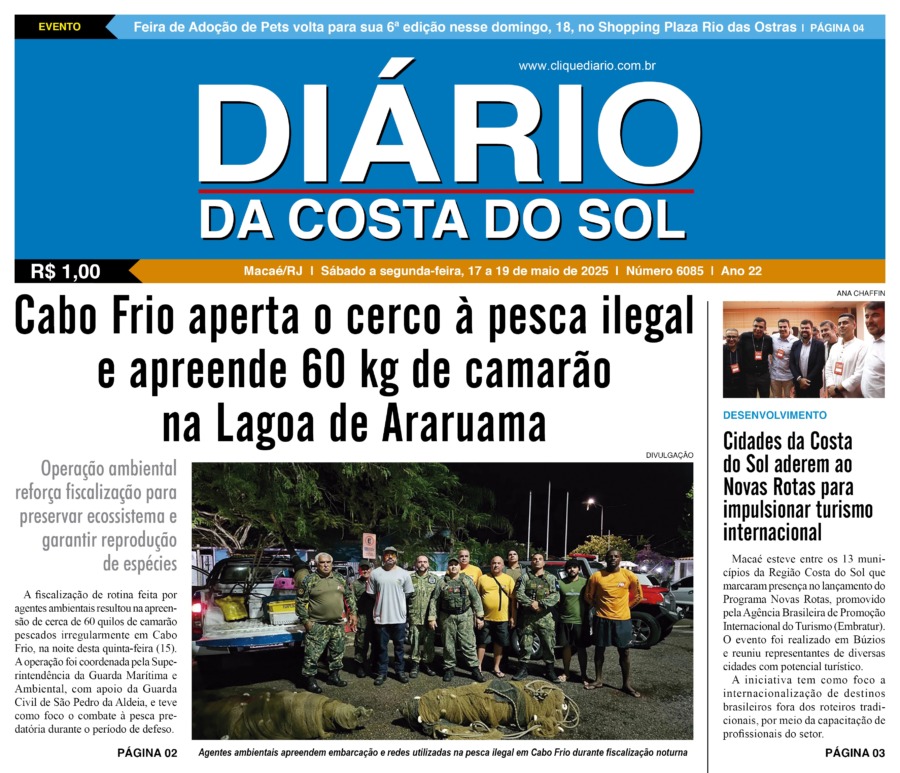Edições Impressas Edição de sábado a segunda-feira 17 a 19/05/2025 nº 6085 Publicado em 17/05/2025 - 08:27 Escrito por Redação Notícias relacionadas: Seguinte Edição de terça-feira 20/05/2025 nº 6086 Anterior Edição de sexta-feira 16/05/2025 nº 6084 Redação Notícias Recentes Polícia3 minutos atrás Três membros de facção criminosa foram presos em Macaé durante operação da Polícia Civil Edições Impressas7 minutos atrás Edição de sexta-feira 14/11/2025 nº 6212 Cidades17 horas atrás Macaé discute armamento da Guarda Municipal como parte de ações para fortalecer a segurança pública Araruama17 horas atrás Presos em Araruama tinham mandados por roubo e associação criminosa Educação17 horas atrás Inscrição para vagas nas creches de Rio das Ostras em 2026 termina nessa sexta, 14 Cabo Frio17 horas atrás Cabo Frio executa nova etapa de sinalização horizontal na cidade Cidades17 horas atrás Agricultores e pecuaristas de Quissamã participam de encontro de capacitação e orientação técnica Arraial do cabo17 horas atrás Nova licença digital promete mais agilidade e transparência em Arraial do Cabo Polícia18 horas atrás Idoso é assassinado a tiros às margens da BR-101, em Campos Esporte18 horas atrás Atletas de Rio das Ostras e Saquarema conquistam título de brasileiro de bodyboarding Clique Diário E. L. Mídia Editora Ltda CNPJ: 09.298.880/0001-07 Redação: Rua Tupinambás 122 Gloria – Macaé/RJ comercial@diariocs.com (22) 2765-7353 (22) 999253130 Mais lidas da semana Cidades3 dias atrás Servidores de Rio das Ostras participam de treinamento do Estado em Búzios Polícia2 dias atrás Farmácia é interditada e uma pessoa é presa em Rio das Ostras em operação da Polícia Federal Cabo Frio7 dias atrás Prefeitura de Cabo Frio premia autoras com experiências culturais e incentivo à leitura Cidades2 dias atrás Vereadores de Macaé vão embarcar nesta quinta para participar da COP 30 em Belém