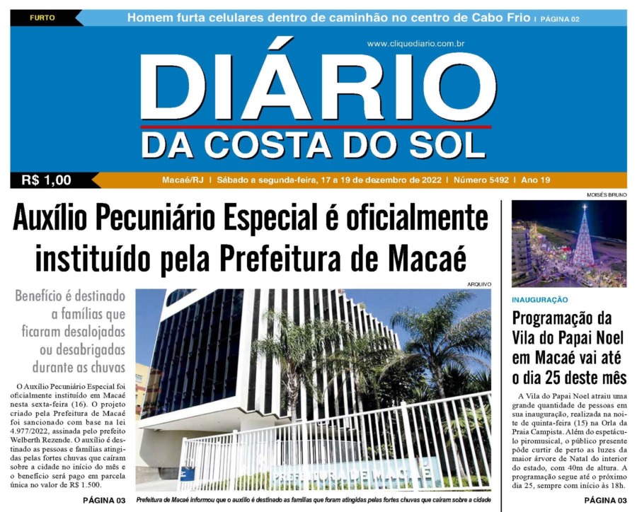 Edições Impressas Edição de sábado a segunda-feira 17 a 19/12/2022 nº 5492 Publicado em 17/12/2022 - 00:03 Escrito por Redação Notícias relacionadas: Seguinte Edição de terça-feira 20/12/2022 nº 5493 Anterior Edição de sexta-feira 16/12/2022 nº 5491 Redação Notícias Recentes Edições Impressas6 horas atrás Edição de sábado a segunda-feira 22 a 24/11/2025 nº 6217 Cultura7 horas atrás Espetáculo de dança se apresenta nesse sábado, 22, no Teatro de Rio das Ostras São Pedro da Aldeia7 horas atrás São Pedro da Aldeia movimenta praças e equipamentos culturais Cabo Frio8 horas atrás Cabo Frio impulsiona negócios locais com a Feira + Forte Cidades8 horas atrás Orla da Imbetiba recebe Feira Multicultural “Afro Macaé” neste sábado Cultura1 dia atrás Festa do Feijão começa nessa sexta-feira, 21, em Cantagalo, em Rio das Ostras Cidades1 dia atrás Quissamã celebra Consciência Negra com atividades culturais em escolas municipais Polícia1 dia atrás Mulher é presa em Campos acusada de maus-tratos contra a própria filha Arraial do cabo1 dia atrás Arraial do Cabo destaca cultura negra com apresentação de Luciana Mello e Mart’nália Arraial do cabo1 dia atrás Arraial do Cabo inicia checagem obrigatória de veículos de passeio Clique Diário E. L. Mídia Editora Ltda CNPJ: 09.298.880/0001-07 Redação: Rua Tupinambás 122 Gloria – Macaé/RJ comercial@diariocs.com (22) 2765-7353 (22) 999253130 Mais lidas da semana Desenvolvimento3 dias atrás Rio das Ostras estreita relações com a Rede Petro BC de olho em eventos do setor de energia em 2026 Cabo Frio2 dias atrás Cabo Frio promove ação do projeto Capoeiragem para registro de documentário Cultura3 dias atrás Moda e Prosa Caipira tem sua 6ª edição nessa quinta, 20, em Saquarema Cidades3 dias atrás Caravana de Natal Coca-Cola passa por Rio das Ostras e Casimiro de Abreu nessa quinta, 20