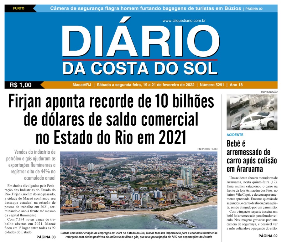 Edições Impressas Edição de sábado a segunda-feira 19 a 21/02/2022 nº 5291 Publicado em 18/02/2022 - 23:56 Escrito por Fernando Vitor Notícias relacionadas: Seguinte Edição de terça-feira 22/02/2022 nº 5292 Anterior Edição de sexta-feira 18_02_2022 nº 5290 Fernando Vitor Notícias Recentes Cidades2 horas atrás Silva Jardim promove solenidade para entrega de Plano de Contingências 2025-2026 Segurança Pública3 horas atrás Prefeito de Rio das Ostras se manifesta após mais uma ação da PM contra barricadas do tráfico Polícia4 horas atrás Homem é detido por envolvimento com o tráfico durante patrulhamento na Nova Holanda, em Macaé Polícia4 horas atrás Polícia apreende grande quantidade de drogas durante operação no Nova Esperança em Macaé Polícia4 horas atrás Polícia recupera carro roubado antes mesmo do registro da ocorrência em Rio das Ostras Edições Impressas4 horas atrás Edição de quinta-feira 13/11/2025 nº 6211 Cidades4 horas atrás Macaé é finalista no Festival Internacional de Cinema Cristão com “A Paixão de Cristo” Cabo Frio21 horas atrás Reforma marca nova fase para o esporte cabo-friense e aniversário da cidade Arraial do cabo21 horas atrás Fórum de Arraial propõe novo modelo de desenvolvimento baseado nos 3Ds; Desvincular, Descarbonizar e Descontaminar Saúde21 horas atrás Saúde de Rio das Ostras promove mutirão de cirurgia pediátrica nessa semana Clique Diário E. L. Mídia Editora Ltda CNPJ: 09.298.880/0001-07 Redação: Rua Tupinambás 122 Gloria – Macaé/RJ comercial@diariocs.com (22) 2765-7353 (22) 999253130 Mais lidas da semana Meio Ambiente7 dias atrás Ações do Programa Limpa Rio seguem em vários pontos de Rio das Ostras Cidades2 dias atrás Servidores de Rio das Ostras participam de treinamento do Estado em Búzios Cidades7 dias atrás Quissamã participa do lançamento do Programa Ambiente Resiliente, do Governo do Estado Polícia1 dia atrás Farmácia é interditada e uma pessoa é presa em Rio das Ostras em operação da Polícia Federal