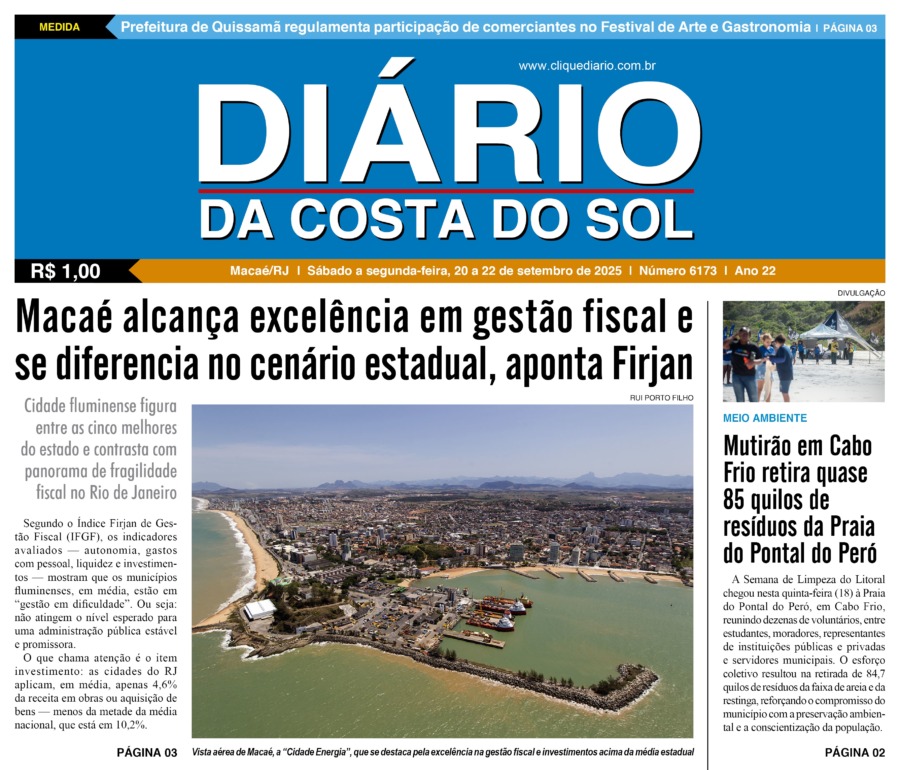 Edições Impressas Edição de sábado a segunda-feira 20 a 22/09/2025 nº 6173 Publicado em 20/09/2025 - 09:32 Escrito por Redação Notícias relacionadas: Seguinte Edição de terça-feira 23/09/2025 nº 6174 Anterior Edição de sexta-feira 19/09/2025 nº 6172 Redação Notícias Recentes Edições Impressas5 horas atrás Edição de sábado a segunda-feira 08 a 10/11/2025 nº 6208 Polícia5 horas atrás Moto sem placa é abandonada após fuga de suspeito em Macaé Polícia6 horas atrás Polícia Civil prende homem em flagrante por tráfico de drogas no Parque Aeroporto, em Macaé Iguaba21 horas atrás Menina de Iguaba Grande realiza sonho e conhece o príncipe William no Rio de Janeiro Arraial do cabo21 horas atrás Arraial do Cabo é exemplo de tranquilidade na Região dos Lagos, segundo dados do ISP Arraial do cabo21 horas atrás Festival em Arraial do Cabo promete recorde de público com mais de 15 mil pratos e 10 mil litros de chope Arraial do cabo22 horas atrás Oficina une saúde, cidadania e acolhimento em Arraial do Cabo Arraial do cabo22 horas atrás Sucesso de público marca o primeiro dia da Arraial Expo XP Cabo Frio22 horas atrás Prefeitura de Cabo Frio premia autoras com experiências culturais e incentivo à leitura Cidades22 horas atrás Macaé realiza audiência pública do Projeto Macaé +20 no dia 10 de dezembro Clique Diário E. L. Mídia Editora Ltda CNPJ: 09.298.880/0001-07 Redação: Rua Tupinambás 122 Gloria – Macaé/RJ comercial@diariocs.com (22) 2765-7353 (22) 999253130 Mais lidas da semana Arraial do cabo2 dias atrás Arraial do Cabo celebra 3ª edição do Festival de Frutos do Mar com entrada livre; Carol Biazin, Ramona Rox, Liah Soares e mais Educação4 dias atrás Estudantes de Rio das Ostras são destaques em evento nacional da Educação Cidades4 dias atrás HFM ganha novo Pronto-Socorro moderno e ampliado em Campos Turismo5 dias atrás Saquarema celebra reconhecimento de projeto pelo Ministério do Turismo