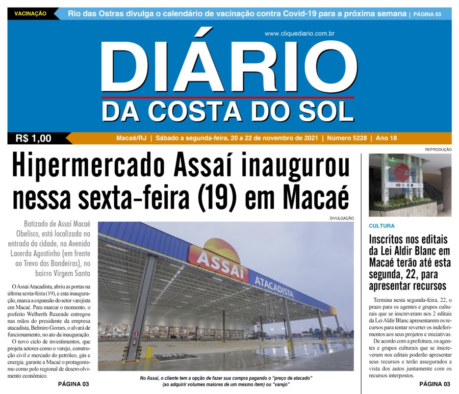Edições Impressas Edição de sábado a segunda-feira 20 a 22/11/2021 nº 5228 Publicado em 20/11/2021 - 00:01 Escrito por Fernando Vitor Notícias relacionadas: Seguinte Edição de terça-feira 23/11/2021 nº 5229 Anterior Edição de sexta-feira 19/11/2021 nº 5227 Fernando Vitor Notícias Recentes Arraial do cabo8 horas atrás Educação de Arraial do Cabo orienta responsáveis sobre rematrícula para o próximo ano Cabo Frio8 horas atrás Evento comercial mais aguardado de Cabo Frio atinge 100% de estandes vendidos Saúde8 horas atrás Rio das Ostras comemora melhorias no atendimento da saúde municipal Cabo Frio9 horas atrás Nova exposição no Palácio das Águias recebe homenagem da cultura negra em Cabo Frio com 44 obras Arraial do cabo9 horas atrás A FIPAC em Arraial do Cabo alerta operadores náuticos: regularizem suas embarcações Comércio9 horas atrás Sindicomércio anuncia abertura do Natal Sesc 2025 em Rio das Ostras e Casimiro de Abreu Polícia10 horas atrás Polícia apreende drogas no Lagomar após varredura motivada por denúncia Polícia10 horas atrás Operação do GAT do 32º BPM apreende drogas, dinheiro e moto sem placa na Favela da Linha Desenvolvimento10 horas atrás Silva Jardim realiza audiência pública de revisão do seu Plano de Saneamento Básico Arraial do cabo12 horas atrás O poder da natureza e da memória em telas na mostra de Fransciscone Araújo em Arraial do Cabo Clique Diário E. L. Mídia Editora Ltda CNPJ: 09.298.880/0001-07 Redação: Rua Tupinambás 122 Gloria – Macaé/RJ comercial@diariocs.com (22) 2765-7353 (22) 999253130 Mais lidas da semana Cultura5 dias atrás Adilson Lopes apresenta exposição “Trajetória” em Casimiro de Abreu Polícia7 dias atrás Farmácia é interditada e uma pessoa é presa em Rio das Ostras em operação da Polícia Federal Meio Ambiente1 dia atrás Lagoa de Iriry, em Rio das Ostras, recebe nova sinalização focada em sustentabilidade Cidades1 dia atrás Macaé registra avanço na coleta seletiva porta a porta e recolhe mais de 2 toneladas em 45 dias