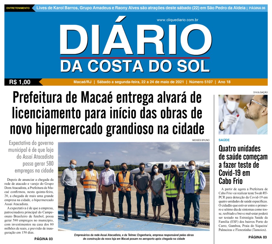 Edições Impressas Edição de sábado a segunda-feira 22 a 24/05/2021 nº 5107 Publicado em 22/05/2021 - 02:28 Escrito por Fernando Vitor Notícias relacionadas:destaque Seguinte Edição de terça-feira 25/05/2021 nº 5108 Anterior Edição de sexta-feira 21/05/2021 nº 5106 Fernando Vitor Notícias Recentes Cabo Frio1 hora atrás Agentes de Cabo Frio recebem novo treinamento técnico para atuar em casos de poluição sonora Cabo Frio2 horas atrás Homem procurado por latrocínio é detido por agentes em Cabo Frio Cabo Frio2 horas atrás Representante da Guarda Civil de Cabo Frio compete na etapa final ao lado de jovens atletas Polícia2 horas atrás Prefeito de Rio das Ostras volta de Brasília com esperança de novos investimentos Cidades2 horas atrás Campos publica 8ª convocação e chama 374 professores substitutos para a rede municipal Esporte3 horas atrás De Saquarema para o Brasileirão: Vasco troca gramado de São Januário Cidades3 horas atrás Quissamã inicia planejamento educacional para 2026 com foco em Educação Financeira Polícia6 horas atrás Mulher é presa na RJ-106, em Saquarema, com R$ 38 mil em drogas e arma Saúde6 horas atrás Silva Jardim tem aulão em alusão à campanha mundial do Novembro Azul Mobilidade7 horas atrás Mobilidade promove fiscalização para verificar situação de táxis em Rio das Ostras Clique Diário E. L. Mídia Editora Ltda CNPJ: 09.298.880/0001-07 Redação: Rua Tupinambás 122 Gloria – Macaé/RJ comercial@diariocs.com (22) 2765-7353 (22) 999253130 Mais lidas da semana Cultura7 horas atrás Adilson Lopes apresenta exposição “Trajetória” em Casimiro de Abreu Polícia2 dias atrás Farmácia é interditada e uma pessoa é presa em Rio das Ostras em operação da Polícia Federal Cidades3 dias atrás Servidores de Rio das Ostras participam de treinamento do Estado em Búzios Cidades2 dias atrás Vereadores de Macaé vão embarcar nesta quinta para participar da COP 30 em Belém