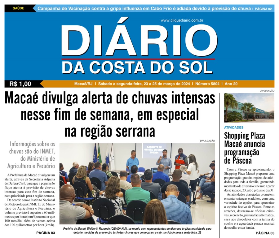 Edições Impressas Edição de sábado a segunda-feira 23 a 25/03/2024 nº 5804 Publicado em 23/03/2024 - 00:00 Escrito por Redação Notícias relacionadas: Seguinte Edição de terça-feira 26/03/2024 nº 5805 Anterior Edição de sexta-feira 22/03/2024 n° 5803 Redação Notícias Recentes Cabo Frio4 horas atrás Cabo Frio promove ação do projeto Capoeiragem para registro de documentário Sem categoria6 horas atrás Cabo Frio recebe iniciativa que vai orientar Política Estadual do Empreendedorismo Edições Impressas11 horas atrás Edição de quinta e sexta-feira 20 e 21/11/2025 nº 6216 Armação dos Búzios1 dia atrás Búzios atinge 80% de ocupação no feriado Cabo Frio1 dia atrás Cabo Frio prepara esquema especial de segurança nas praias e áreas de lazer Cabo Frio1 dia atrás Cabo Frio realiza ações de proteção a fauna após aparecimento de animais em bairros Cabo Frio1 dia atrás Cabo Frio reúne especialistas em evento do programa “Vim Cuidar de Você” Desenvolvimento1 dia atrás Rio das Ostras estreita relações com a Rede Petro BC de olho em eventos do setor de energia em 2026 Cabo Frio1 dia atrás Aula-passeio apresenta riqueza cultural e ambiental de Cabo Frio na Fazenda Campos Novos Cabo Frio1 dia atrás Cabo Frio suspende expediente em órgãos públicos nesta sexta Clique Diário E. L. Mídia Editora Ltda CNPJ: 09.298.880/0001-07 Redação: Rua Tupinambás 122 Gloria – Macaé/RJ comercial@diariocs.com (22) 2765-7353 (22) 999253130 Mais lidas da semana Cultura6 dias atrás Adilson Lopes apresenta exposição “Trajetória” em Casimiro de Abreu Cabo Frio4 horas atrás Cabo Frio promove ação do projeto Capoeiragem para registro de documentário Desenvolvimento1 dia atrás Rio das Ostras estreita relações com a Rede Petro BC de olho em eventos do setor de energia em 2026 Cultura1 dia atrás Moda e Prosa Caipira tem sua 6ª edição nessa quinta, 20, em Saquarema