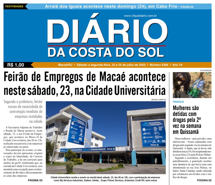 Edições Impressas Edição de sábado a segunda-feira 23 a 25/07/2022 nº 5392 Publicado em 22/07/2022 - 23:55 Escrito por Fernando Vitor Notícias relacionadas: Seguinte Edição de terça-feira 26/07/2022 nº 5393 Anterior Edição de sexta-feira 22/07/2022 nº 5391 Fernando Vitor Notícias Recentes Cultura17 horas atrás Teatro de Rio das Ostras recebe 2 espetáculos de dança nesse fim de semana Arraial do cabo17 horas atrás FIPAC oferece serviços de saúde e prevenção ao câncer de próstata em Arraial do Cabo Arraial do cabo17 horas atrás Resultado preliminar do concurso de Arraial já está no ar pelo IBAM Edições Impressas17 horas atrás Edição de sábado a segunda-feira 15 a 17/11/2025 nº 6213 Cidades19 horas atrás Shopping Plaza Macaé inicia programação de Natal neste fim de semana Cabo Frio19 horas atrás Disputa em dobro marca encerramento em Cabo Frio do circuito de surf Cabo Frio1 dia atrás Agentes de Cabo Frio recebem novo treinamento técnico para atuar em casos de poluição sonora Cabo Frio1 dia atrás Homem procurado por latrocínio é detido por agentes em Cabo Frio Cabo Frio1 dia atrás Representante da Guarda Civil de Cabo Frio compete na etapa final ao lado de jovens atletas Polícia1 dia atrás Prefeito de Rio das Ostras volta de Brasília com esperança de novos investimentos Clique Diário E. L. Mídia Editora Ltda CNPJ: 09.298.880/0001-07 Redação: Rua Tupinambás 122 Gloria – Macaé/RJ comercial@diariocs.com (22) 2765-7353 (22) 999253130 Mais lidas da semana Cultura2 dias atrás Adilson Lopes apresenta exposição “Trajetória” em Casimiro de Abreu Polícia4 dias atrás Farmácia é interditada e uma pessoa é presa em Rio das Ostras em operação da Polícia Federal Cidades4 dias atrás Servidores de Rio das Ostras participam de treinamento do Estado em Búzios Cidades3 dias atrás Vereadores de Macaé vão embarcar nesta quinta para participar da COP 30 em Belém