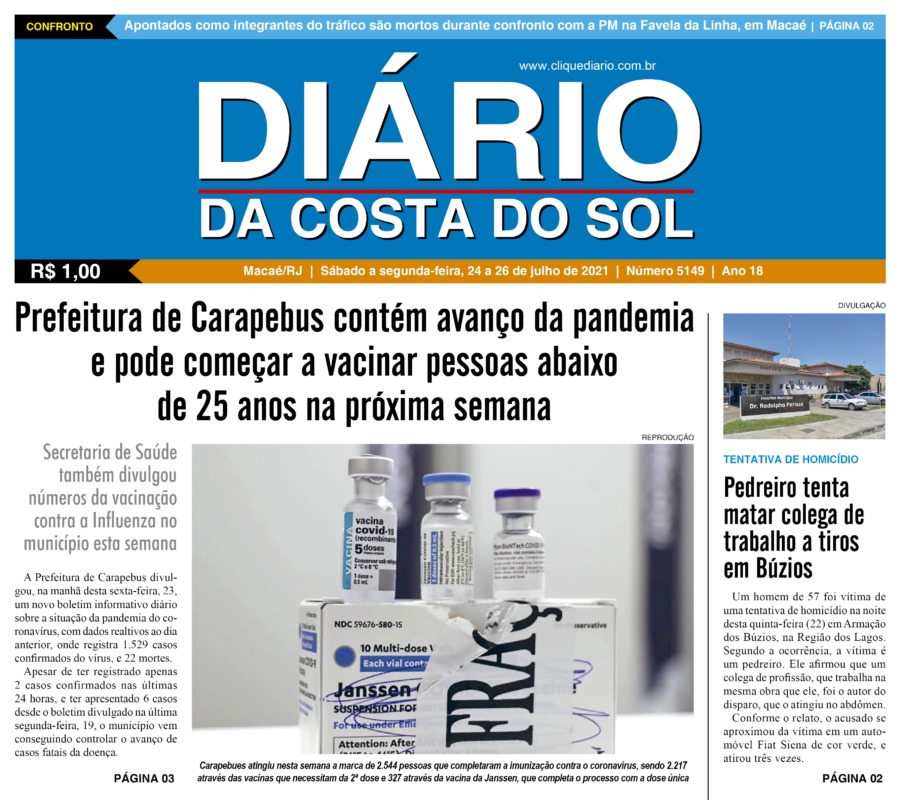 Edições Impressas Edição de sábado a segunda-feira 24 a 26/07/2021 n° 5149 Publicado em 24/07/2021 - 00:01 Escrito por Fernando Vitor Notícias relacionadas: Seguinte Edição de terça-feira 27/07/2021 n° 5150 Anterior Edição de sexta-feira 23/07/2021 n° 5148 Fernando Vitor Notícias Recentes Cidades11 horas atrás Macaé registra avanço na coleta seletiva porta a porta e recolhe mais de 2 toneladas em 45 dias Meio Ambiente12 horas atrás Lagoa de Iriry, em Rio das Ostras, recebe nova sinalização focada em sustentabilidade Araruama12 horas atrás Araruama busca ampliar diálogo sobre saneamento antes de concluir revisão do PMSB Cabo Frio12 horas atrás Câmeras flagram colisão no restaurante Tia maluca seguida de fuga no Centro de Cabo Frio Cabo Frio12 horas atrás Cabo Frio reforça proteção ambiental após depredação na Trilha Translagunar Cabo Frio12 horas atrás Cabo Frio reúne especialistas para debater estratégias de enfrentamento às drogas Polícia13 horas atrás Homem morre e outro fica ferido em ataque a tiros em Travessão, em Campos dos Goytacazes Polícia13 horas atrás Polícia prende 2 homens em operação contra o tráfico de drogas em Rio das Ostras Arraial do cabo13 horas atrás Ação da Guarda Municipal e COMTRANS em Arraial coíbe prática perigosa em área turística Arraial do cabo13 horas atrás Município de Arraial organiza atividade crescente e amplia controle das rotas Clique Diário E. L. Mídia Editora Ltda CNPJ: 09.298.880/0001-07 Redação: Rua Tupinambás 122 Gloria – Macaé/RJ comercial@diariocs.com (22) 2765-7353 (22) 999253130 Mais lidas da semana Cultura4 dias atrás Adilson Lopes apresenta exposição “Trajetória” em Casimiro de Abreu Polícia6 dias atrás Farmácia é interditada e uma pessoa é presa em Rio das Ostras em operação da Polícia Federal Cidades7 dias atrás Servidores de Rio das Ostras participam de treinamento do Estado em Búzios Edições Impressas6 dias atrás Edição de quarta-feira 12/11/2025 nº 6210