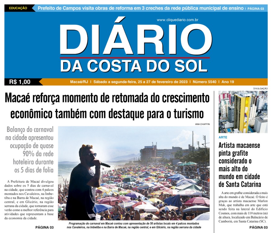Edições Impressas Edição de sábado a segunda-feira 25 a 27_02_2023 nº 5540 Publicado em 24/02/2023 - 23:55 Escrito por Redação Notícias relacionadas: Seguinte Edição de terça-feira 28/02/2023 nº 5541 Anterior Edição de sexta-feira 24/02/2023 nº 5539 Redação Notícias Recentes Cidades3 horas atrás Região serrana de Macaé recebe 1º X-Force Passeio de Quadriciclo e Aranha neste domingo (26) Polícia3 horas atrás Polícia apreende mais de meio quilo de drogas no Loteamento São João, em Rio das Ostras Saúde22 horas atrás Eventos esportivo e cultural reforça campanha do Outubro Rosa em Rio das Ostras nesse domingo, 26 Edições Impressas1 dia atrás Sábado a segunda-feira 25 a 27/10/2025 nº 6197 Cidades1 dia atrás Shopping Plaza Macaé oferece programação gratuita com feira de adoção e show de pagode neste fim de semana Cidades2 dias atrás 32º BPM completa 23 anos com solenidade de celebração e reconhecimento aos policiais Armação dos Búzios2 dias atrás Búzios celebra esporte e superação com XC RUN 2025 Araruama2 dias atrás Araruama promove saúde, lazer e cidadania em evento comunitário Arraial do cabo2 dias atrás Educação e sustentabilidade se encontram para jovens de Arraial do Cabo Cidades2 dias atrás Quissamã avança na reformulação do Currículo Municipal de Educação Clique Diário E. L. Mídia Editora Ltda CNPJ: 09.298.880/0001-07 Redação: Rua Tupinambás 122 Gloria – Macaé/RJ comercial@diariocs.com (22) 2765-7353 (22) 999253130 Mais lidas da semana Cultura6 dias atrás Silva Jardim anuncia shows gratuitos de samba e pagode para o fim de semana Cultura5 dias atrás Música, emoção e cores: Rodrigo Pontes apresenta show especial em Rio das Ostras Cabo Frio6 dias atrás Atletas de várias cidades se enfrentam em competição de Muay Thai em Cabo Frio Edições Impressas4 dias atrás Edição de quarta-feira 22/10/2025 nº 6195