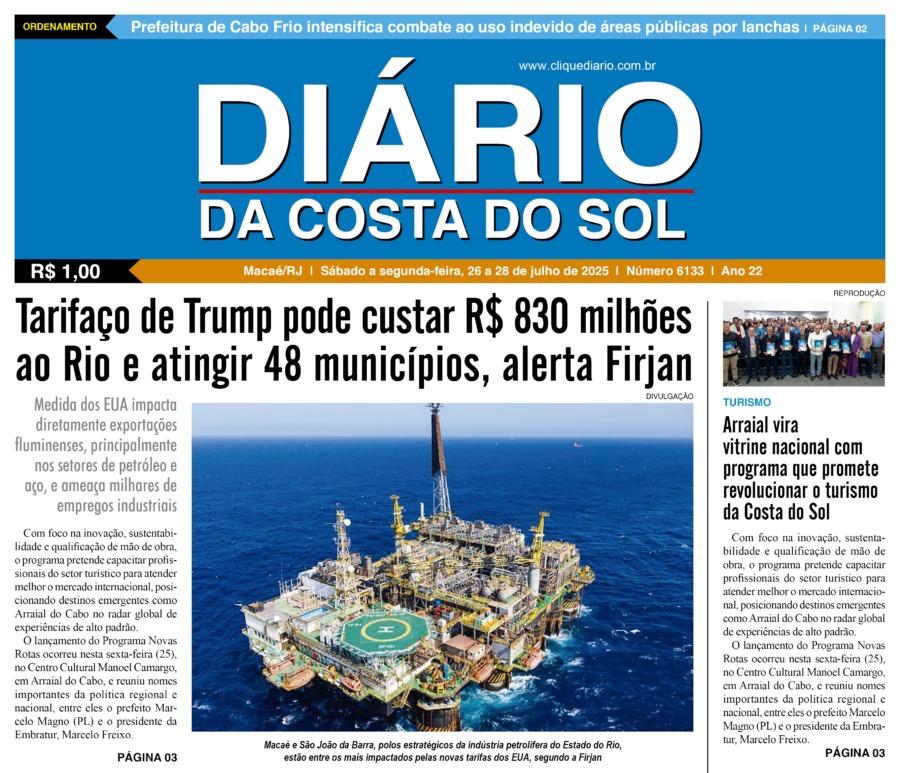 Edições Impressas Edição de Sábado a segunda-feira 26 a 28/07/2025 nº 6133 Publicado em 26/07/2025 - 09:32 Escrito por Redação Notícias relacionadas: Seguinte Edição de terça-feira 29/07/2025 nº 6134 Anterior Edição de sexta-feira 25/07/2025 nº 6132 Redação Notícias Recentes Cidades18 horas atrás 32º BPM completa 23 anos com solenidade de celebração e reconhecimento aos policiais Armação dos Búzios18 horas atrás Búzios celebra esporte e superação com XC RUN 2025 Araruama18 horas atrás Araruama promove saúde, lazer e cidadania em evento comunitário Arraial do cabo18 horas atrás Educação e sustentabilidade se encontram para jovens de Arraial do Cabo Cidades18 horas atrás Quissamã avança na reformulação do Currículo Municipal de Educação Arraial do cabo18 horas atrás PIPE estimula presença e desempenho de alunos da rede pública de Arraial em programa estudantil Cabo Frio18 horas atrás Prefeitura de Cabo Frio prepara espaço para visitação no Dia de Finados Polícia18 horas atrás Dois homens são presos após furto a residência em Campos Cabo Frio18 horas atrás Câmara de Cabo Frio recebe debate sobre finanças municipais Cabo Frio18 horas atrás Projeto Mar Sem Lixo promove mostra ambiental com apoio da Secretaria de Meio Ambiente em Cabo Frio Clique Diário E. L. Mídia Editora Ltda CNPJ: 09.298.880/0001-07 Redação: Rua Tupinambás 122 Gloria – Macaé/RJ comercial@diariocs.com (22) 2765-7353 (22) 999253130 Mais lidas da semana Cultura5 dias atrás Silva Jardim anuncia shows gratuitos de samba e pagode para o fim de semana Arraial do cabo5 dias atrás Prisão em flagrante marca operação da Patrulha Maria da Penha em Arraial do Cabo Polícia5 dias atrás Policiais da PRF salvam bebê engasgado na BR-101, em Campos Edições Impressas3 dias atrás Edição de quarta-feira 22/10/2025 nº 6195