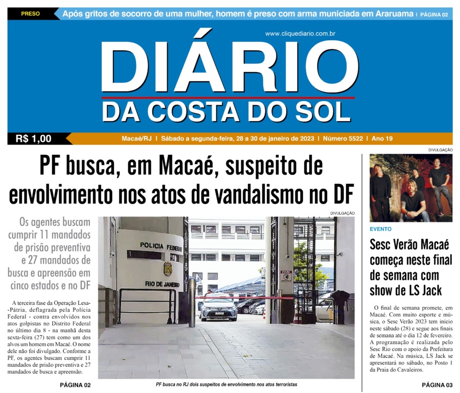 Edições Impressas Edição de sábado a segunda-feira 28 a 30/01/2023 nº 5522 Publicado em 27/01/2023 - 23:55 Escrito por Redação Notícias relacionadas: Seguinte Edição de terça-feira 31/01/2023 nº 5523 Anterior Edição de sexta-feira 27/01/2023 nº 5521 Redação Notícias Recentes Cabo Frio10 horas atrás Arte e solidariedade marcam a 1ª Mostra de Dança Regional de Tamoios Cidades15 horas atrás Região serrana de Macaé recebe 1º X-Force Passeio de Quadriciclo e Aranha neste domingo (26) Polícia15 horas atrás Polícia apreende mais de meio quilo de drogas no Loteamento São João, em Rio das Ostras Saúde1 dia atrás Eventos esportivo e cultural reforça campanha do Outubro Rosa em Rio das Ostras nesse domingo, 26 Edições Impressas2 dias atrás Sábado a segunda-feira 25 a 27/10/2025 nº 6197 Cidades2 dias atrás Shopping Plaza Macaé oferece programação gratuita com feira de adoção e show de pagode neste fim de semana Cidades2 dias atrás 32º BPM completa 23 anos com solenidade de celebração e reconhecimento aos policiais Armação dos Búzios2 dias atrás Búzios celebra esporte e superação com XC RUN 2025 Araruama2 dias atrás Araruama promove saúde, lazer e cidadania em evento comunitário Arraial do cabo2 dias atrás Educação e sustentabilidade se encontram para jovens de Arraial do Cabo Clique Diário E. L. Mídia Editora Ltda CNPJ: 09.298.880/0001-07 Redação: Rua Tupinambás 122 Gloria – Macaé/RJ comercial@diariocs.com (22) 2765-7353 (22) 999253130 Mais lidas da semana Cultura6 dias atrás Silva Jardim anuncia shows gratuitos de samba e pagode para o fim de semana Cultura6 dias atrás Música, emoção e cores: Rodrigo Pontes apresenta show especial em Rio das Ostras Cabo Frio6 dias atrás Atletas de várias cidades se enfrentam em competição de Muay Thai em Cabo Frio Cabo Frio6 dias atrás Serviços essenciais permanecem ativos durante ponto facultativo em Cabo Frio