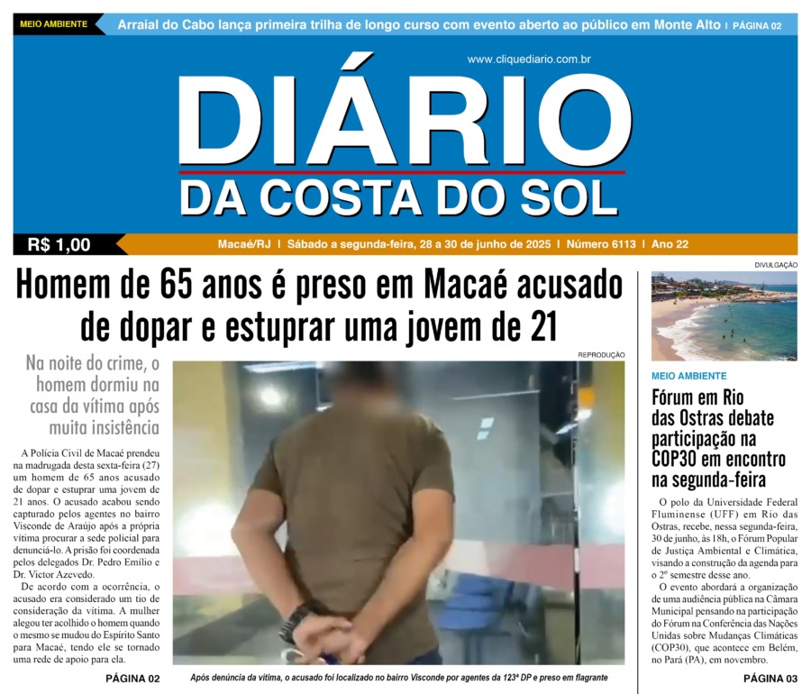 Edições Impressas Edição de sábado a segunda-feira 28 a 30/06/2025 nº 6113 Publicado em 28/06/2025 - 09:32 Escrito por Redação Notícias relacionadas: Seguinte Edição de terça-feira 01/07/2025 nº 6114 Anterior Edição de sexta-feira 27/06/2025 nº 6112 Redação Notícias Recentes Cabo Frio24 minutos atrás Reforma marca nova fase para o esporte cabo-friense e aniversário da cidade Arraial do cabo28 minutos atrás Fórum de Arraial propõe novo modelo de desenvolvimento baseado nos 3Ds; Desvincular, Descarbonizar e Descontaminar Saúde56 minutos atrás Saúde de Rio das Ostras promove mutirão de cirurgia pediátrica nessa semana Cidades57 minutos atrás Guarda Ambiental resgata jiboia de três metros em área urbana de Macaé Cidades1 hora atrás Vereadores de Macaé vão embarcar nesta quinta para participar da COP 30 em Belém Arraial do cabo1 hora atrás Parceria com a PF fortalece preparo técnico da Segurança Pública de Arraial do Cabo Arraial do cabo2 horas atrás Iniciativa busca compensar emissões de carbono da frota de Arraial Cidades2 horas atrás Parceria com o Estado reforça prevenção de enchentes em Rio das Ostras há 39 dias do verão Desenvolvimento3 horas atrás Arteris vence novo leilão da BR-101 e mantém operação da via até 2047 Cidades3 horas atrás Prefeitura de Quissamã abre prazo para solicitação de isenção do IPTU 2026 e 2027 Clique Diário E. L. Mídia Editora Ltda CNPJ: 09.298.880/0001-07 Redação: Rua Tupinambás 122 Gloria – Macaé/RJ comercial@diariocs.com (22) 2765-7353 (22) 999253130 Mais lidas da semana Arraial do cabo6 dias atrás Arraial do Cabo celebra 3ª edição do Festival de Frutos do Mar com entrada livre; Carol Biazin, Ramona Rox, Liah Soares e mais Meio Ambiente6 dias atrás Ações do Programa Limpa Rio seguem em vários pontos de Rio das Ostras Cidades6 dias atrás Quissamã participa do lançamento do Programa Ambiente Resiliente, do Governo do Estado Cidades1 dia atrás Servidores de Rio das Ostras participam de treinamento do Estado em Búzios