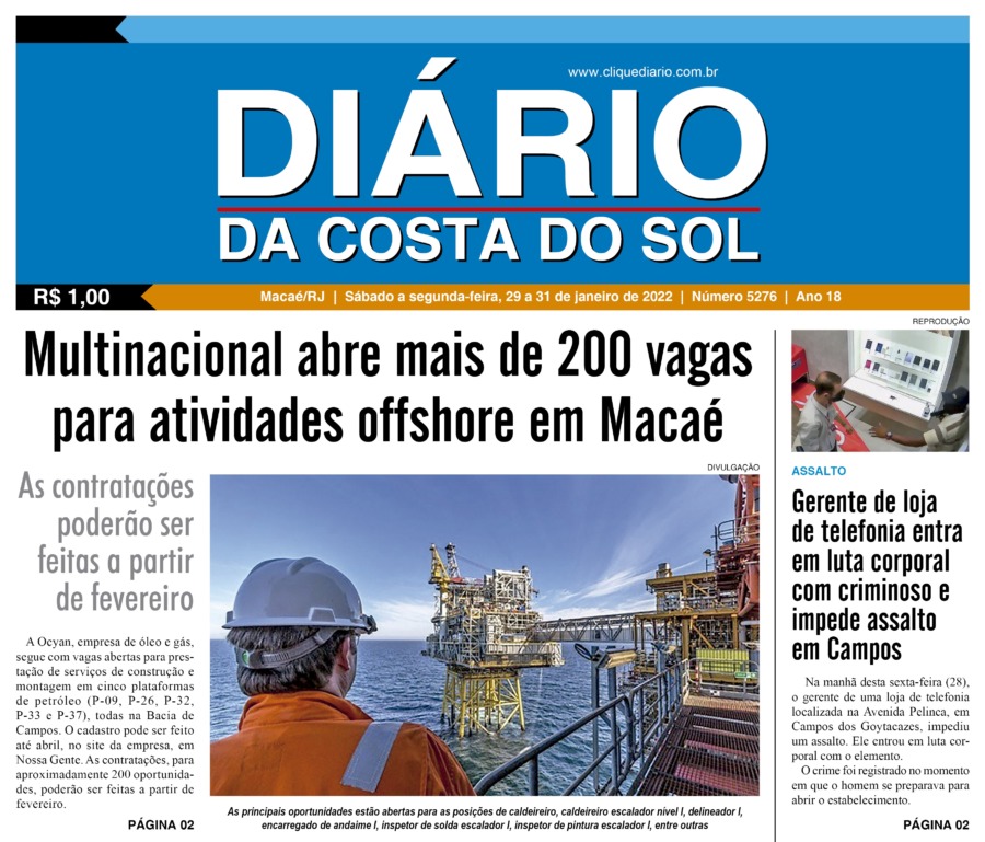 Edições Impressas Edição de sábado a segunda-feira, 29 a 31/01/2022 nº 5276 Publicado em 28/01/2022 - 23:58 Escrito por Fernando Vitor Notícias relacionadas: Seguinte Edição de terça-feira 01/02/2022 nº 5277 Anterior Edição de sexta-feira 28/01/2022 nº 5275 Fernando Vitor Notícias Recentes Cultura1 hora atrás Moda e Prosa Caipira tem sua 6ª edição nessa quinta, 20, em Saquarema Comércio3 horas atrás Rio das Ostras tem 19ª edição de sua tradicional feira outlet nesse feriado Cidades3 horas atrás Macaé recebe 20ª edição do Prefeitura Presente no dia 25 de novembro Polícia4 horas atrás Denúncia anônima leva à prisão de duas mulheres por tráfico em Macaé Cidades4 horas atrás Caravana de Natal Coca-Cola passa por Rio das Ostras e Casimiro de Abreu nessa quinta, 20 Edições Impressas5 horas atrás Edição de quarta-feira 19/11/2025 nº 6215 Arraial do cabo21 horas atrás Educação de Arraial do Cabo orienta responsáveis sobre rematrícula para o próximo ano Cabo Frio21 horas atrás Evento comercial mais aguardado de Cabo Frio atinge 100% de estandes vendidos Saúde22 horas atrás Rio das Ostras comemora melhorias no atendimento da saúde municipal Cabo Frio22 horas atrás Nova exposição no Palácio das Águias recebe homenagem da cultura negra em Cabo Frio com 44 obras Clique Diário E. L. Mídia Editora Ltda CNPJ: 09.298.880/0001-07 Redação: Rua Tupinambás 122 Gloria – Macaé/RJ comercial@diariocs.com (22) 2765-7353 (22) 999253130 Mais lidas da semana Cultura5 dias atrás Adilson Lopes apresenta exposição “Trajetória” em Casimiro de Abreu Cidades2 dias atrás Macaé registra avanço na coleta seletiva porta a porta e recolhe mais de 2 toneladas em 45 dias Meio Ambiente2 dias atrás Lagoa de Iriry, em Rio das Ostras, recebe nova sinalização focada em sustentabilidade Mobilidade5 dias atrás Mobilidade promove fiscalização para verificar situação de táxis em Rio das Ostras