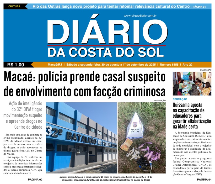 Edições Impressas Edição de sábado a segunda-feira 30/08 a 01/09/2025 nº 6158 Publicado em 30/08/2025 - 09:18 Escrito por Redação Notícias relacionadas: Seguinte Edição de terça-feira 02/09/2025 nº 6159 Anterior Edição de sexta-feira 29/08/2025 nº 6157 Redação Notícias Recentes Cabo Frio21 horas atrás Estudantes de Cabo Frio brilham em premiação do projeto CaptaAção Armação dos Búzios1 dia atrás Búzios Swim celebra esporte, natureza e turismo na Região dos Lagos Cabo Frio1 dia atrás Educação pública de Cabo Frio colhe frutos com conquistas em competições científicas Edições Impressas1 dia atrás Edição de sábado a segunda-feira 08 a 10/11/2025 nº 6208 Polícia1 dia atrás Moto sem placa é abandonada após fuga de suspeito em Macaé Polícia1 dia atrás Polícia Civil prende homem em flagrante por tráfico de drogas no Parque Aeroporto, em Macaé Iguaba2 dias atrás Menina de Iguaba Grande realiza sonho e conhece o príncipe William no Rio de Janeiro Arraial do cabo2 dias atrás Arraial do Cabo é exemplo de tranquilidade na Região dos Lagos, segundo dados do ISP Arraial do cabo2 dias atrás Festival em Arraial do Cabo promete recorde de público com mais de 15 mil pratos e 10 mil litros de chope Arraial do cabo2 dias atrás Oficina une saúde, cidadania e acolhimento em Arraial do Cabo Clique Diário E. L. Mídia Editora Ltda CNPJ: 09.298.880/0001-07 Redação: Rua Tupinambás 122 Gloria – Macaé/RJ comercial@diariocs.com (22) 2765-7353 (22) 999253130 Mais lidas da semana Arraial do cabo3 dias atrás Arraial do Cabo celebra 3ª edição do Festival de Frutos do Mar com entrada livre; Carol Biazin, Ramona Rox, Liah Soares e mais Meio Ambiente4 dias atrás Programa do governo estadual promove limpeza de rio no Âncora, em Rio das Ostras Meio Ambiente3 dias atrás Ações do Programa Limpa Rio seguem em vários pontos de Rio das Ostras Turismo6 dias atrás Saquarema celebra reconhecimento de projeto pelo Ministério do Turismo