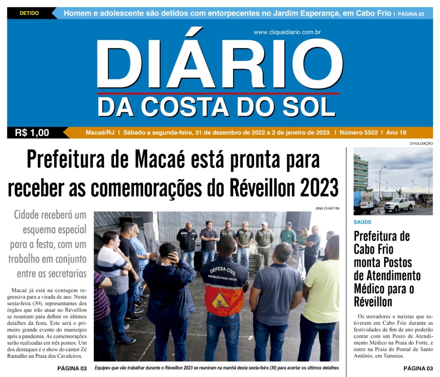 Edições Impressas Edição de sábado a segunda-feira 31/12/2022 a 02/01/2023 nº 5502 Publicado em 31/12/2022 - 00:00 Escrito por Redação Notícias relacionadas: Seguinte Edição de terça-feira 03/01/2023 nº 5503 Anterior Edição de sexta-feira 30/12/2022 nº 5501 Redação Notícias Recentes Edições Impressas6 horas atrás Edição de sábado a segunda-feira 22 a 24/11/2025 nº 6217 Cultura7 horas atrás Espetáculo de dança se apresenta nesse sábado, 22, no Teatro de Rio das Ostras São Pedro da Aldeia7 horas atrás São Pedro da Aldeia movimenta praças e equipamentos culturais Cabo Frio8 horas atrás Cabo Frio impulsiona negócios locais com a Feira + Forte Cidades8 horas atrás Orla da Imbetiba recebe Feira Multicultural “Afro Macaé” neste sábado Cultura1 dia atrás Festa do Feijão começa nessa sexta-feira, 21, em Cantagalo, em Rio das Ostras Cidades1 dia atrás Quissamã celebra Consciência Negra com atividades culturais em escolas municipais Polícia1 dia atrás Mulher é presa em Campos acusada de maus-tratos contra a própria filha Arraial do cabo1 dia atrás Arraial do Cabo destaca cultura negra com apresentação de Luciana Mello e Mart’nália Arraial do cabo1 dia atrás Arraial do Cabo inicia checagem obrigatória de veículos de passeio Clique Diário E. L. Mídia Editora Ltda CNPJ: 09.298.880/0001-07 Redação: Rua Tupinambás 122 Gloria – Macaé/RJ comercial@diariocs.com (22) 2765-7353 (22) 999253130 Mais lidas da semana Desenvolvimento3 dias atrás Rio das Ostras estreita relações com a Rede Petro BC de olho em eventos do setor de energia em 2026 Cabo Frio2 dias atrás Cabo Frio promove ação do projeto Capoeiragem para registro de documentário Cultura3 dias atrás Moda e Prosa Caipira tem sua 6ª edição nessa quinta, 20, em Saquarema Cidades3 dias atrás Caravana de Natal Coca-Cola passa por Rio das Ostras e Casimiro de Abreu nessa quinta, 20
