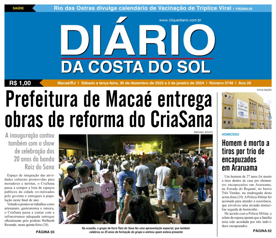 Edições Impressas Edição de sábado a terça-feira 30/12/2023 a 02/01/2024 nº 5748 Publicado em 29/12/2023 - 23:55 Escrito por Redação Notícias relacionadas: Seguinte Edição de quarta-feira 03/01/2024 nº 5749 Anterior Edição de sexta-feira 29/12/2023 nº 5747 Redação Notícias Recentes Edições Impressas6 horas atrás Sábado a segunda-feira 25 a 27/10/2025 nº 6197 Cidades7 horas atrás Shopping Plaza Macaé oferece programação gratuita com feira de adoção e show de pagode neste fim de semana Cidades23 horas atrás 32º BPM completa 23 anos com solenidade de celebração e reconhecimento aos policiais Armação dos Búzios23 horas atrás Búzios celebra esporte e superação com XC RUN 2025 Araruama23 horas atrás Araruama promove saúde, lazer e cidadania em evento comunitário Arraial do cabo23 horas atrás Educação e sustentabilidade se encontram para jovens de Arraial do Cabo Cidades24 horas atrás Quissamã avança na reformulação do Currículo Municipal de Educação Arraial do cabo24 horas atrás PIPE estimula presença e desempenho de alunos da rede pública de Arraial em programa estudantil Cabo Frio24 horas atrás Prefeitura de Cabo Frio prepara espaço para visitação no Dia de Finados Polícia24 horas atrás Dois homens são presos após furto a residência em Campos Clique Diário E. L. Mídia Editora Ltda CNPJ: 09.298.880/0001-07 Redação: Rua Tupinambás 122 Gloria – Macaé/RJ comercial@diariocs.com (22) 2765-7353 (22) 999253130 Mais lidas da semana Cultura5 dias atrás Silva Jardim anuncia shows gratuitos de samba e pagode para o fim de semana Polícia5 dias atrás Policiais da PRF salvam bebê engasgado na BR-101, em Campos Edições Impressas3 dias atrás Edição de quarta-feira 22/10/2025 nº 6195 Cultura4 dias atrás Música, emoção e cores: Rodrigo Pontes apresenta show especial em Rio das Ostras