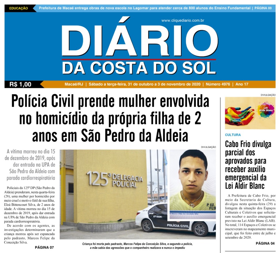 Edições Impressas Edição de sábado a terça-feira 31_10 a 03/11/2020 nº 4976 Publicado em 31/10/2020 - 01:14 Escrito por Fernando Vitor Notícias relacionadas:destaque Seguinte Edição de quarta-feira 04/11/2020 nº 4977 Anterior Edição de sexta-feira 30/10/2020 nº 4975 Fernando Vitor Notícias Recentes São Pedro da Aldeia1 hora atrás Feirão de Empregabilidade promete movimentar a Praça das Águas em São Pedro da Aldeia Diversão2 horas atrás Praia do Abricó, em Rio das Ostras, sedia evento fitness nesse fim de semana Arraial do cabo2 horas atrás Feira de Ciências e Tecnologia em Arraial tem visita ilustre dos cães da Segurança Pública Arraial do cabo2 horas atrás Arraial do Cabo tem renovação da certificação Internacional de turismo sustentável na Lagoa do Caiçara Cabo Frio2 horas atrás Cercamento e plantio de espécies nativas marcam nova fase de recuperação ambiental em Cabo Frio Cidades2 horas atrás Homem é preso com grande quantidade de drogas no Lagomar, em Macaé Cidades2 horas atrás Alerj aprova projeto que garante salário integral a familiares de PMs mortos em combate Cidades3 horas atrás GCM de Campos participa de curso de operador da Patrulha Maria da Penha em Niterói Meio Ambiente3 horas atrás Ações do Programa Limpa Rio seguem em vários pontos de Rio das Ostras Cidades3 horas atrás Quissamã participa do lançamento do Programa Ambiente Resiliente, do Governo do Estado Clique Diário E. L. Mídia Editora Ltda CNPJ: 09.298.880/0001-07 Redação: Rua Tupinambás 122 Gloria – Macaé/RJ comercial@diariocs.com (22) 2765-7353 (22) 999253130 Mais lidas da semana Mobilidade6 dias atrás Rio das Ostras intensifica ações de combate a irregularidades no trânsito Cidades2 dias atrás HFM ganha novo Pronto-Socorro moderno e ampliado em Campos Educação6 dias atrás Cerimônia no Teatro fecha o 2º Prêmio Literário do Ensino Fundamental de Rio das Ostras Cultura6 dias atrás Nova temporada do Rio das Ostras Instrumental apresenta show de Nico Rezende