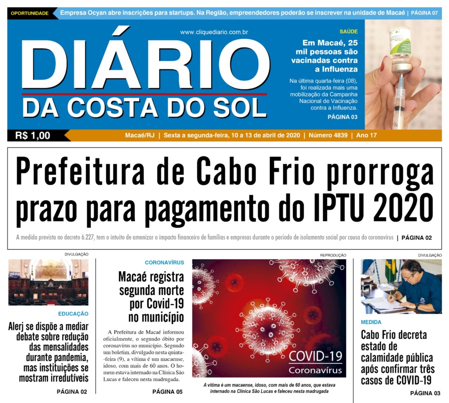 Edições Impressas Edição de Sexta a Seg, 10 a 13/04/2020 nº 4839 Publicado em 10/04/2020 - 07:00 Escrito por Fernando Vitor Notícias relacionadas: Seguinte Edição de terça-feira, 14/04/2020 nº 4840 Anterior Edição de quinta-feira, 09/04/2020 nº 4838 Fernando Vitor Notícias Recentes Cabo Frio6 horas atrás Governo municipal de Cabo Frio busca equilíbrio entre lazer, turismo e moradia na Passagem Saúde7 horas atrás Rio das Ostras inicia ação contra produtos usados em unhas em gel, proibidos pela Anvisa Cidades8 horas atrás Câmara de Macaé aprova criação da Política de Prevenção à Violência contra Educadores Cidades8 horas atrás Atleta de Macaé é campeão brasileiro de eFootball no eBrasileirão 2025 Cultura8 horas atrás Festival de Frutos do Mar de Rio das Ostras começa nessa quarta, 5 Cidades8 horas atrás HFM ganha novo Pronto-Socorro moderno e ampliado em Campos Cultura9 horas atrás Saquarema anuncia programação da FLIS com grandes nomes da música e literatura Arraial do cabo10 horas atrás Secretaria de Turismo de Arraial do Cabo realiza reunião para garantir organização e segurança do Festival de Frutos do Mar Arraial do cabo10 horas atrás Centro Cultural Manoel Camargo em Arraial do Cabo amplia atividades e lança nova turma de dança Cabo Frio10 horas atrás Administração municipal de Cabo Frio reforça que cursos e vagas são divulgados apenas nos canais oficiais Clique Diário E. L. Mídia Editora Ltda CNPJ: 09.298.880/0001-07 Redação: Rua Tupinambás 122 Gloria – Macaé/RJ comercial@diariocs.com (22) 2765-7353 (22) 999253130 Mais lidas da semana Cultura6 dias atrás Orange Sound faz tributo ao Kid Abelha nessa quinta, 30, no Teatro de Rio das Ostras Cidades6 dias atrás Silva Jardim tem evento do Outubro Rosa nessa quinta, 30, no Teatro Arraial do cabo6 dias atrás Castração sem custo é retomada em Arraial do Cabo para controle populacional de gatos Cultura7 dias atrás Prédio da Onda, em Rio das Ostras, recebe oficina teatral gratuita a partir dessa quinta, 30