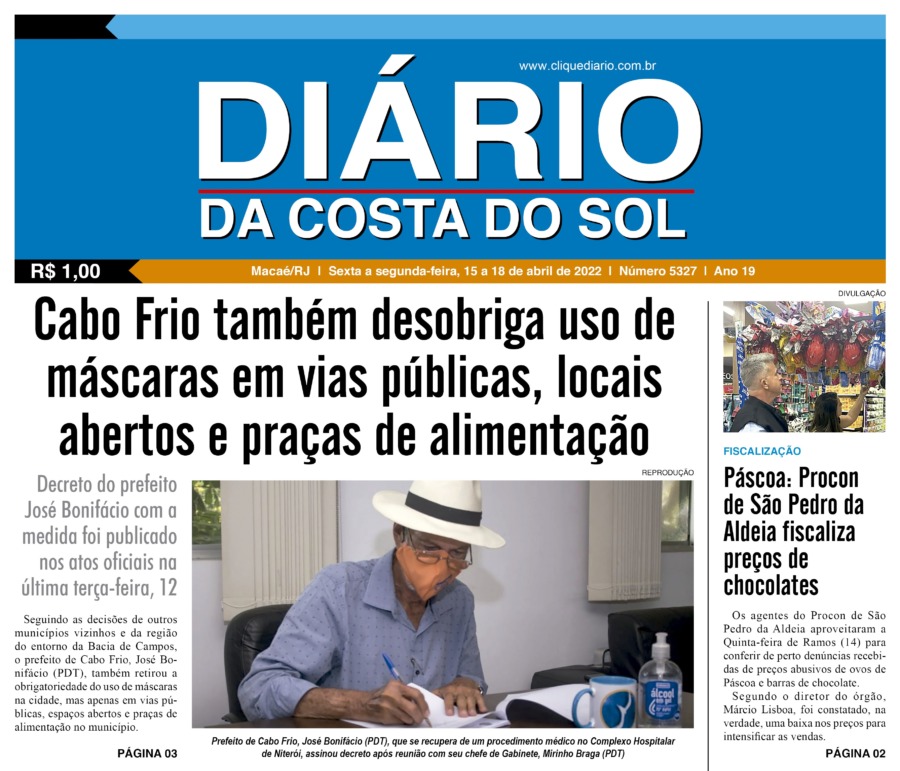 Edições Impressas Edição de sexta a segunda-feira 15 a 18/04/2022 nº 5327 Publicado em 14/04/2022 - 23:55 Escrito por Fernando Vitor Notícias relacionadas: Seguinte Edição de terça-feira 19/04/2022 nº 5328 Anterior Edição de quinta-feira 14/04/2022 nº 5326 Fernando Vitor Notícias Recentes Cabo Frio2 minutos atrás Cabo Frio prepara esquema especial de segurança nas praias e áreas de lazer Cabo Frio6 minutos atrás Cabo Frio realiza ações de proteção a fauna após aparecimento de animais em bairros Cabo Frio19 minutos atrás Cabo Frio reúne especialistas em evento do programa “Vim Cuidar de Você” Desenvolvimento19 minutos atrás Rio das Ostras estreita relações com a Rede Petro BC de olho em eventos do setor de energia em 2026 Cabo Frio22 minutos atrás Aula-passeio apresenta riqueza cultural e ambiental de Cabo Frio na Fazenda Campos Novos Cabo Frio26 minutos atrás Cabo Frio suspende expediente em órgãos públicos nesta sexta Cidades28 minutos atrás Macaé terá Dia do Futebol Feminino e programa para valorização da mulher rural Arraial do cabo29 minutos atrás Carreta científica desembarca em Arraial do Cabo com programação gratuita Polícia47 minutos atrás Polícia Civil prende liderança do ADA no bairro Fronteira em Macaé Cidades1 hora atrás Homem é detido em Campos após ser encontrado com arma municiada durante patrulha Clique Diário E. L. Mídia Editora Ltda CNPJ: 09.298.880/0001-07 Redação: Rua Tupinambás 122 Gloria – Macaé/RJ comercial@diariocs.com (22) 2765-7353 (22) 999253130 Mais lidas da semana Cultura5 dias atrás Adilson Lopes apresenta exposição “Trajetória” em Casimiro de Abreu Meio Ambiente2 dias atrás Lagoa de Iriry, em Rio das Ostras, recebe nova sinalização focada em sustentabilidade Cidades6 dias atrás Macaé é finalista no Festival Internacional de Cinema Cristão com “A Paixão de Cristo” Esporte5 dias atrás De Saquarema para o Brasileirão: Vasco troca gramado de São Januário