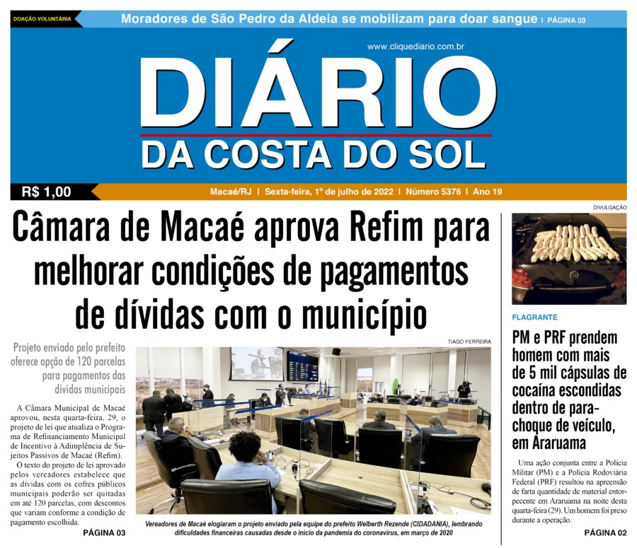 Edições Impressas Edição de sexta-feira 01/07/2022 nº 5376 Publicado em 30/06/2022 - 23:55 Escrito por Fernando Vitor Notícias relacionadas: Seguinte Edição de sábado a segunda-feira 02 a 04/07/2022 nº 5377 Anterior Edição de quinta-feira 30/06/2022 nº 5375 Fernando Vitor Notícias Recentes Cabo Frio27 segundos atrás Cabo Frio prepara esquema especial de segurança nas praias e áreas de lazer Cabo Frio4 minutos atrás Cabo Frio realiza ações de proteção a fauna após aparecimento de animais em bairros Cabo Frio17 minutos atrás Cabo Frio reúne especialistas em evento do programa “Vim Cuidar de Você” Desenvolvimento17 minutos atrás Rio das Ostras estreita relações com a Rede Petro BC de olho em eventos do setor de energia em 2026 Cabo Frio20 minutos atrás Aula-passeio apresenta riqueza cultural e ambiental de Cabo Frio na Fazenda Campos Novos Cabo Frio24 minutos atrás Cabo Frio suspende expediente em órgãos públicos nesta sexta Cidades26 minutos atrás Macaé terá Dia do Futebol Feminino e programa para valorização da mulher rural Arraial do cabo28 minutos atrás Carreta científica desembarca em Arraial do Cabo com programação gratuita Polícia45 minutos atrás Polícia Civil prende liderança do ADA no bairro Fronteira em Macaé Cidades1 hora atrás Homem é detido em Campos após ser encontrado com arma municiada durante patrulha Clique Diário E. L. Mídia Editora Ltda CNPJ: 09.298.880/0001-07 Redação: Rua Tupinambás 122 Gloria – Macaé/RJ comercial@diariocs.com (22) 2765-7353 (22) 999253130 Mais lidas da semana Cultura5 dias atrás Adilson Lopes apresenta exposição “Trajetória” em Casimiro de Abreu Mobilidade5 dias atrás Mobilidade promove fiscalização para verificar situação de táxis em Rio das Ostras Esporte5 dias atrás De Saquarema para o Brasileirão: Vasco troca gramado de São Januário Cidades2 dias atrás Macaé registra avanço na coleta seletiva porta a porta e recolhe mais de 2 toneladas em 45 dias