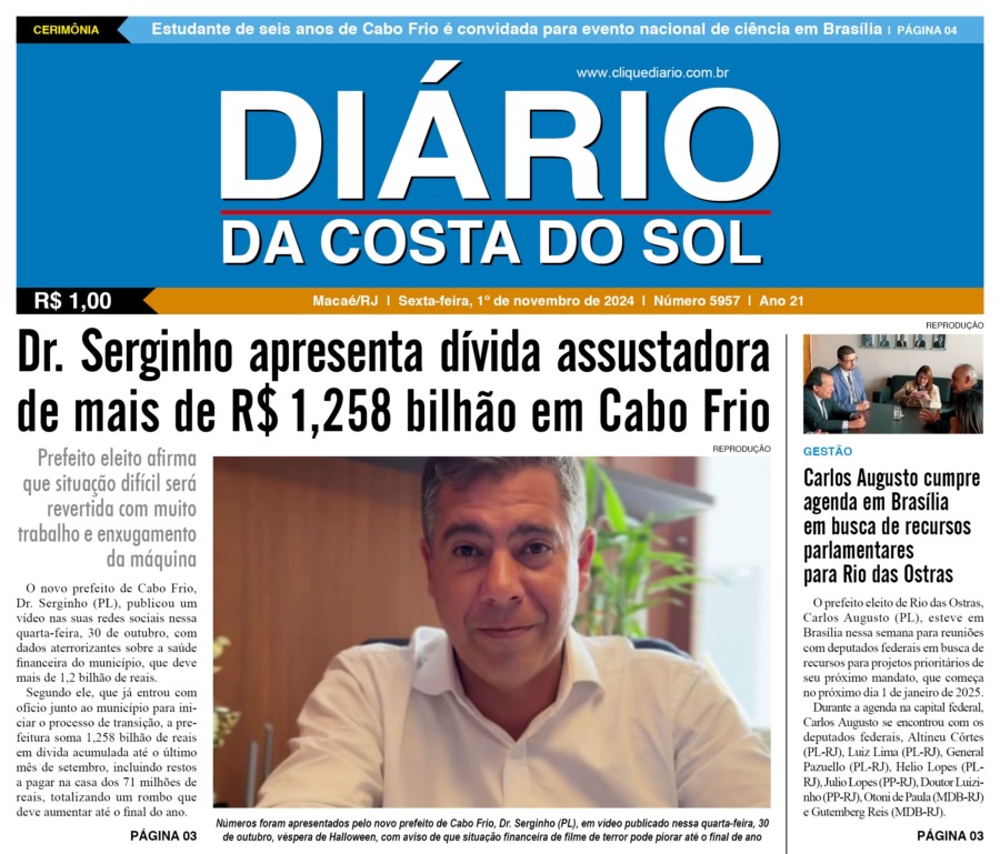 Edições Impressas Edição de sexta-feira 01/11/2024 nº 5957 Publicado em 01/11/2024 - 00:00 Escrito por Redação Notícias relacionadas: Seguinte Edição de Sábado a Segunda-feira 02 a 04/11/2024 nº 5958 Anterior Edição de quinta-feira 31/10/2024 nº 5956 Redação Notícias Recentes Cidades33 minutos atrás Macaé realizou 5ª Corrida e Caminhada Outubro Rosa Novembro Azul na orla da Imbetiba Cidades36 minutos atrás Rio das Ostras autua Rio+ por mais um caso de vazamento de esgoto na cidade Cabo Frio42 minutos atrás Ação da Prefeitura e AAMA leva reflexão sobre autocuidado e prevenção do câncer de mama em Cabo Frio Cidades45 minutos atrás Casa do Servidor em Macaé ultrapassa 7 mil atendimentos em oito meses de funcionamento Polícia58 minutos atrás Foragido da Justiça é preso pela PM na BR-101 em Campos Araruama1 hora atrás Prefeitura define plano de segurança integrado para a Expo Araruama Iguaba1 hora atrás Prefeitura de Iguaba Grande prepara nova turma de aprendizes para atuação em órgãos públicos Cabo Frio1 hora atrás Mostra de Dança movimenta Cabo Frio com apresentações, solidariedade e cultura local Cabo Frio1 hora atrás Cabo Frio dá início à formação obrigatória para ambulantes das praias Polícia2 horas atrás Homem é preso com rádios transmissores em depósito de Casimiro de Abreu Clique Diário E. L. Mídia Editora Ltda CNPJ: 09.298.880/0001-07 Redação: Rua Tupinambás 122 Gloria – Macaé/RJ comercial@diariocs.com (22) 2765-7353 (22) 999253130 Mais lidas da semana Edições Impressas5 dias atrás Edição de quarta-feira 22/10/2025 nº 6195 Arraial do cabo7 dias atrás Prisão em flagrante marca operação da Patrulha Maria da Penha em Arraial do Cabo Cultura6 dias atrás Música, emoção e cores: Rodrigo Pontes apresenta show especial em Rio das Ostras Edições Impressas4 dias atrás Edição de quinta-feira 23/10/2025 nº 6196