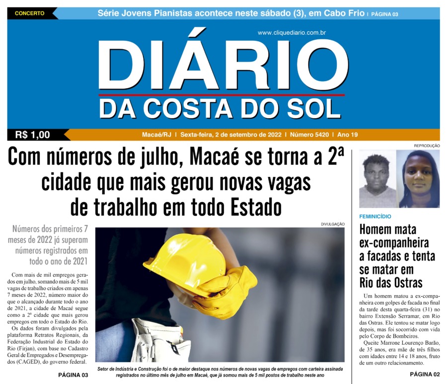 Edições Impressas Edição de sexta-feira 02/09/2022 nº 5420 Publicado em 01/09/2022 - 23:55 Escrito por Fernando Vitor Notícias relacionadas: Seguinte Edição de sábado a segunda-feira 03 a 05/09/2022 nº 5421 Anterior Edição de quinta-feira 01/09/2022 nº 5419 Fernando Vitor Notícias Recentes Armação dos Búzios12 horas atrás Búzios atinge 80% de ocupação no feriado Cabo Frio13 horas atrás Cabo Frio prepara esquema especial de segurança nas praias e áreas de lazer Cabo Frio13 horas atrás Cabo Frio realiza ações de proteção a fauna após aparecimento de animais em bairros Cabo Frio13 horas atrás Cabo Frio reúne especialistas em evento do programa “Vim Cuidar de Você” Desenvolvimento13 horas atrás Rio das Ostras estreita relações com a Rede Petro BC de olho em eventos do setor de energia em 2026 Cabo Frio13 horas atrás Aula-passeio apresenta riqueza cultural e ambiental de Cabo Frio na Fazenda Campos Novos Cabo Frio13 horas atrás Cabo Frio suspende expediente em órgãos públicos nesta sexta Cidades13 horas atrás Macaé terá Dia do Futebol Feminino e programa para valorização da mulher rural Arraial do cabo13 horas atrás Carreta científica desembarca em Arraial do Cabo com programação gratuita Polícia13 horas atrás Polícia Civil prende liderança do ADA no bairro Fronteira em Macaé Clique Diário E. L. Mídia Editora Ltda CNPJ: 09.298.880/0001-07 Redação: Rua Tupinambás 122 Gloria – Macaé/RJ comercial@diariocs.com (22) 2765-7353 (22) 999253130 Mais lidas da semana Cultura6 dias atrás Adilson Lopes apresenta exposição “Trajetória” em Casimiro de Abreu Desenvolvimento13 horas atrás Rio das Ostras estreita relações com a Rede Petro BC de olho em eventos do setor de energia em 2026 Cidades3 dias atrás Macaé registra avanço na coleta seletiva porta a porta e recolhe mais de 2 toneladas em 45 dias Mobilidade6 dias atrás Mobilidade promove fiscalização para verificar situação de táxis em Rio das Ostras