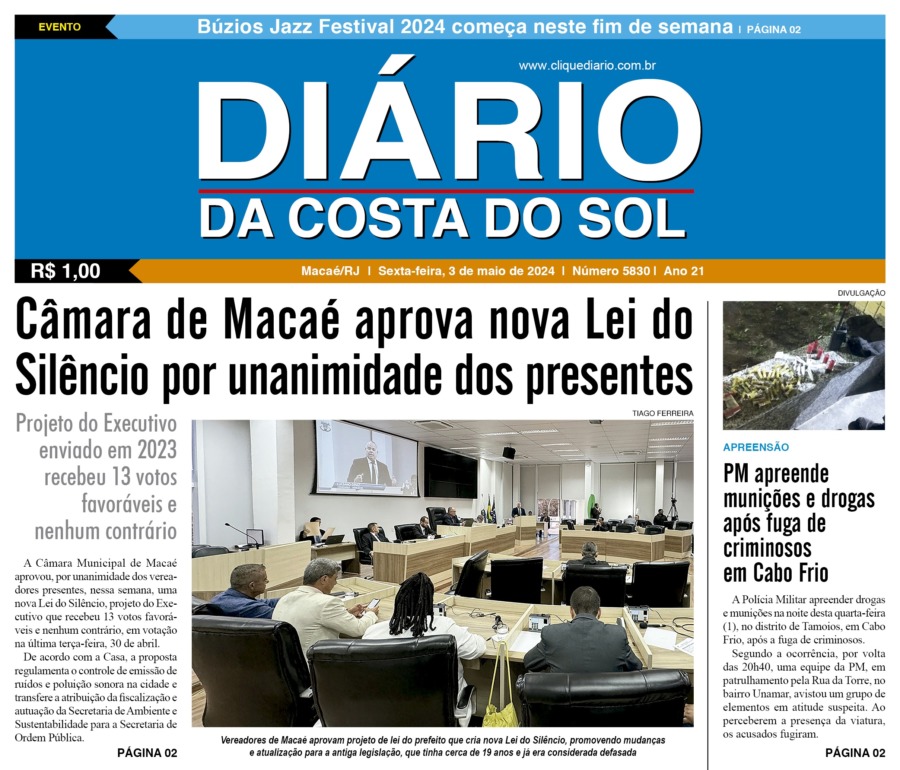 Edições Impressas Edição de sexta-feira 03/05/2024 nº 5830 Publicado em 02/05/2024 - 23:55 Escrito por Redação Notícias relacionadas: Seguinte Edição de sábado a segunda-feira 04 a 06/05/2024 nº 5831 Anterior Edição de quarta e quinta-feira 01 e 02/04/2024 nº 5829 Redação Notícias Recentes Cabo Frio3 horas atrás Cabo Frio promove ação do projeto Capoeiragem para registro de documentário Sem categoria5 horas atrás Cabo Frio recebe iniciativa que vai orientar Política Estadual do Empreendedorismo Edições Impressas10 horas atrás Edição de quinta e sexta-feira 20 e 21/11/2025 nº 6216 Armação dos Búzios1 dia atrás Búzios atinge 80% de ocupação no feriado Cabo Frio1 dia atrás Cabo Frio prepara esquema especial de segurança nas praias e áreas de lazer Cabo Frio1 dia atrás Cabo Frio realiza ações de proteção a fauna após aparecimento de animais em bairros Cabo Frio1 dia atrás Cabo Frio reúne especialistas em evento do programa “Vim Cuidar de Você” Desenvolvimento1 dia atrás Rio das Ostras estreita relações com a Rede Petro BC de olho em eventos do setor de energia em 2026 Cabo Frio1 dia atrás Aula-passeio apresenta riqueza cultural e ambiental de Cabo Frio na Fazenda Campos Novos Cabo Frio1 dia atrás Cabo Frio suspende expediente em órgãos públicos nesta sexta Clique Diário E. L. Mídia Editora Ltda CNPJ: 09.298.880/0001-07 Redação: Rua Tupinambás 122 Gloria – Macaé/RJ comercial@diariocs.com (22) 2765-7353 (22) 999253130 Mais lidas da semana Desenvolvimento1 dia atrás Rio das Ostras estreita relações com a Rede Petro BC de olho em eventos do setor de energia em 2026 Cabo Frio3 horas atrás Cabo Frio promove ação do projeto Capoeiragem para registro de documentário Cultura6 dias atrás Adilson Lopes apresenta exposição “Trajetória” em Casimiro de Abreu Cultura1 dia atrás Moda e Prosa Caipira tem sua 6ª edição nessa quinta, 20, em Saquarema