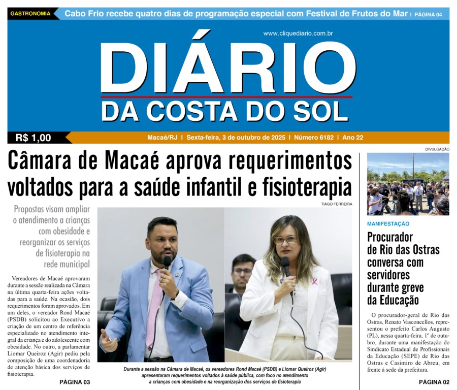 Edições Impressas Edição de sexta-feira 03/10/2025 nº 6182 Publicado em 03/10/2025 - 08:35 Escrito por Redação Notícias relacionadas: Seguinte Edição de sábado a segunda-feira 04 a 06/10/2025 nº 6183 Anterior Edição de quinta-feira 02/10/2025 nº 6181 Redação Notícias Recentes Armação dos Búzios11 horas atrás Búzios atinge 80% de ocupação no feriado Cabo Frio11 horas atrás Cabo Frio prepara esquema especial de segurança nas praias e áreas de lazer Cabo Frio11 horas atrás Cabo Frio realiza ações de proteção a fauna após aparecimento de animais em bairros Cabo Frio12 horas atrás Cabo Frio reúne especialistas em evento do programa “Vim Cuidar de Você” Desenvolvimento12 horas atrás Rio das Ostras estreita relações com a Rede Petro BC de olho em eventos do setor de energia em 2026 Cabo Frio12 horas atrás Aula-passeio apresenta riqueza cultural e ambiental de Cabo Frio na Fazenda Campos Novos Cabo Frio12 horas atrás Cabo Frio suspende expediente em órgãos públicos nesta sexta Cidades12 horas atrás Macaé terá Dia do Futebol Feminino e programa para valorização da mulher rural Arraial do cabo12 horas atrás Carreta científica desembarca em Arraial do Cabo com programação gratuita Polícia12 horas atrás Polícia Civil prende liderança do ADA no bairro Fronteira em Macaé Clique Diário E. L. Mídia Editora Ltda CNPJ: 09.298.880/0001-07 Redação: Rua Tupinambás 122 Gloria – Macaé/RJ comercial@diariocs.com (22) 2765-7353 (22) 999253130 Mais lidas da semana Cultura6 dias atrás Adilson Lopes apresenta exposição “Trajetória” em Casimiro de Abreu Desenvolvimento12 horas atrás Rio das Ostras estreita relações com a Rede Petro BC de olho em eventos do setor de energia em 2026 Cidades2 dias atrás Macaé registra avanço na coleta seletiva porta a porta e recolhe mais de 2 toneladas em 45 dias Mobilidade6 dias atrás Mobilidade promove fiscalização para verificar situação de táxis em Rio das Ostras