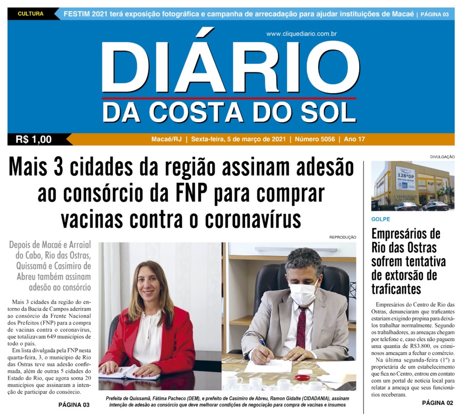 Edições Impressas Edição de sexta-feira 05/03/2021 nº 5056 Publicado em 05/03/2021 - 02:31 Escrito por Fernando Vitor Notícias relacionadas:destaque Seguinte Edição de Sábado a segunda-feira 06 a 08/03/2021 nº 5057 Anterior Edição de quinta-feira 04 /03/2021 nº 5055 Fernando Vitor Notícias Recentes Cabo Frio4 horas atrás Reforma marca nova fase para o esporte cabo-friense e aniversário da cidade Arraial do cabo4 horas atrás Fórum de Arraial propõe novo modelo de desenvolvimento baseado nos 3Ds; Desvincular, Descarbonizar e Descontaminar Saúde4 horas atrás Saúde de Rio das Ostras promove mutirão de cirurgia pediátrica nessa semana Cidades4 horas atrás Guarda Ambiental resgata jiboia de três metros em área urbana de Macaé Cidades4 horas atrás Vereadores de Macaé vão embarcar nesta quinta para participar da COP 30 em Belém Arraial do cabo5 horas atrás Parceria com a PF fortalece preparo técnico da Segurança Pública de Arraial do Cabo Arraial do cabo5 horas atrás Iniciativa busca compensar emissões de carbono da frota de Arraial Cidades5 horas atrás Parceria com o Estado reforça prevenção de enchentes em Rio das Ostras há 39 dias do verão Desenvolvimento6 horas atrás Arteris vence novo leilão da BR-101 e mantém operação da via até 2047 Cidades6 horas atrás Prefeitura de Quissamã abre prazo para solicitação de isenção do IPTU 2026 e 2027 Clique Diário E. L. Mídia Editora Ltda CNPJ: 09.298.880/0001-07 Redação: Rua Tupinambás 122 Gloria – Macaé/RJ comercial@diariocs.com (22) 2765-7353 (22) 999253130 Mais lidas da semana Arraial do cabo6 dias atrás Arraial do Cabo celebra 3ª edição do Festival de Frutos do Mar com entrada livre; Carol Biazin, Ramona Rox, Liah Soares e mais Meio Ambiente6 dias atrás Ações do Programa Limpa Rio seguem em vários pontos de Rio das Ostras Cidades6 dias atrás Quissamã participa do lançamento do Programa Ambiente Resiliente, do Governo do Estado Cidades1 dia atrás Servidores de Rio das Ostras participam de treinamento do Estado em Búzios