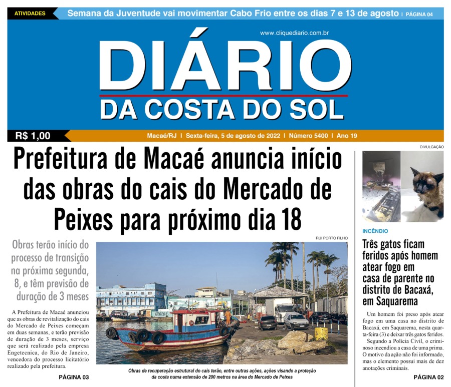 Edições Impressas Edição de sexta-feira 05/08/2022 nº 5400 Publicado em 04/08/2022 - 23:55 Escrito por Fernando Vitor Notícias relacionadas: Seguinte Edição de sábado a segunda-feira 06 a 08/08/2022 nº 5401 Anterior Edição de quinta-feira 04/08/2022 nº 5399 Fernando Vitor Notícias Recentes Cultura15 minutos atrás Feriado da Consciência Negra tem programação em Rio das Ostras nessa quinta, 20 Cidadania44 minutos atrás Distrito de Casimiro de Abreu recebe Programa RJ para Todos, do governo estadual Cultura3 horas atrás Moda e Prosa Caipira tem sua 6ª edição nessa quinta, 20, em Saquarema Comércio4 horas atrás Rio das Ostras tem 19ª edição de sua tradicional feira outlet nesse feriado Cidades4 horas atrás Macaé recebe 20ª edição do Prefeitura Presente no dia 25 de novembro Polícia5 horas atrás Denúncia anônima leva à prisão de duas mulheres por tráfico em Macaé Cidades5 horas atrás Caravana de Natal Coca-Cola passa por Rio das Ostras e Casimiro de Abreu nessa quinta, 20 Edições Impressas7 horas atrás Edição de quarta-feira 19/11/2025 nº 6215 Arraial do cabo23 horas atrás Educação de Arraial do Cabo orienta responsáveis sobre rematrícula para o próximo ano Cabo Frio23 horas atrás Evento comercial mais aguardado de Cabo Frio atinge 100% de estandes vendidos Clique Diário E. L. Mídia Editora Ltda CNPJ: 09.298.880/0001-07 Redação: Rua Tupinambás 122 Gloria – Macaé/RJ comercial@diariocs.com (22) 2765-7353 (22) 999253130 Mais lidas da semana Cultura5 dias atrás Adilson Lopes apresenta exposição “Trajetória” em Casimiro de Abreu Mobilidade5 dias atrás Mobilidade promove fiscalização para verificar situação de táxis em Rio das Ostras Cidades6 dias atrás Macaé é finalista no Festival Internacional de Cinema Cristão com “A Paixão de Cristo” Esporte5 dias atrás De Saquarema para o Brasileirão: Vasco troca gramado de São Januário