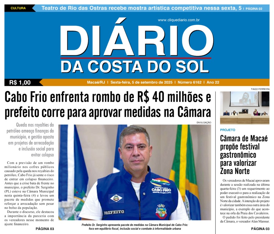 Edições Impressas Edição de sexta-feira 05/09/2025 nº 6162 Publicado em 05/09/2025 - 08:25 Escrito por Redação Notícias relacionadas: Seguinte Edição de sábado a segunda-feira 06 a 08/09/2025 nº 6163 Anterior Edição de quinta-feira 04/09/2025 nº 6161 Redação Notícias Recentes Cabo Frio12 horas atrás Estudantes de Cabo Frio brilham em premiação do projeto CaptaAção Armação dos Búzios16 horas atrás Búzios Swim celebra esporte, natureza e turismo na Região dos Lagos Cabo Frio18 horas atrás Educação pública de Cabo Frio colhe frutos com conquistas em competições científicas Edições Impressas18 horas atrás Edição de sábado a segunda-feira 08 a 10/11/2025 nº 6208 Polícia18 horas atrás Moto sem placa é abandonada após fuga de suspeito em Macaé Polícia19 horas atrás Polícia Civil prende homem em flagrante por tráfico de drogas no Parque Aeroporto, em Macaé Iguaba1 dia atrás Menina de Iguaba Grande realiza sonho e conhece o príncipe William no Rio de Janeiro Arraial do cabo1 dia atrás Arraial do Cabo é exemplo de tranquilidade na Região dos Lagos, segundo dados do ISP Arraial do cabo1 dia atrás Festival em Arraial do Cabo promete recorde de público com mais de 15 mil pratos e 10 mil litros de chope Arraial do cabo1 dia atrás Oficina une saúde, cidadania e acolhimento em Arraial do Cabo Clique Diário E. L. Mídia Editora Ltda CNPJ: 09.298.880/0001-07 Redação: Rua Tupinambás 122 Gloria – Macaé/RJ comercial@diariocs.com (22) 2765-7353 (22) 999253130 Mais lidas da semana Arraial do cabo3 dias atrás Arraial do Cabo celebra 3ª edição do Festival de Frutos do Mar com entrada livre; Carol Biazin, Ramona Rox, Liah Soares e mais Turismo6 dias atrás Saquarema celebra reconhecimento de projeto pelo Ministério do Turismo Educação5 dias atrás Estudantes de Rio das Ostras são destaques em evento nacional da Educação Cidades5 dias atrás HFM ganha novo Pronto-Socorro moderno e ampliado em Campos