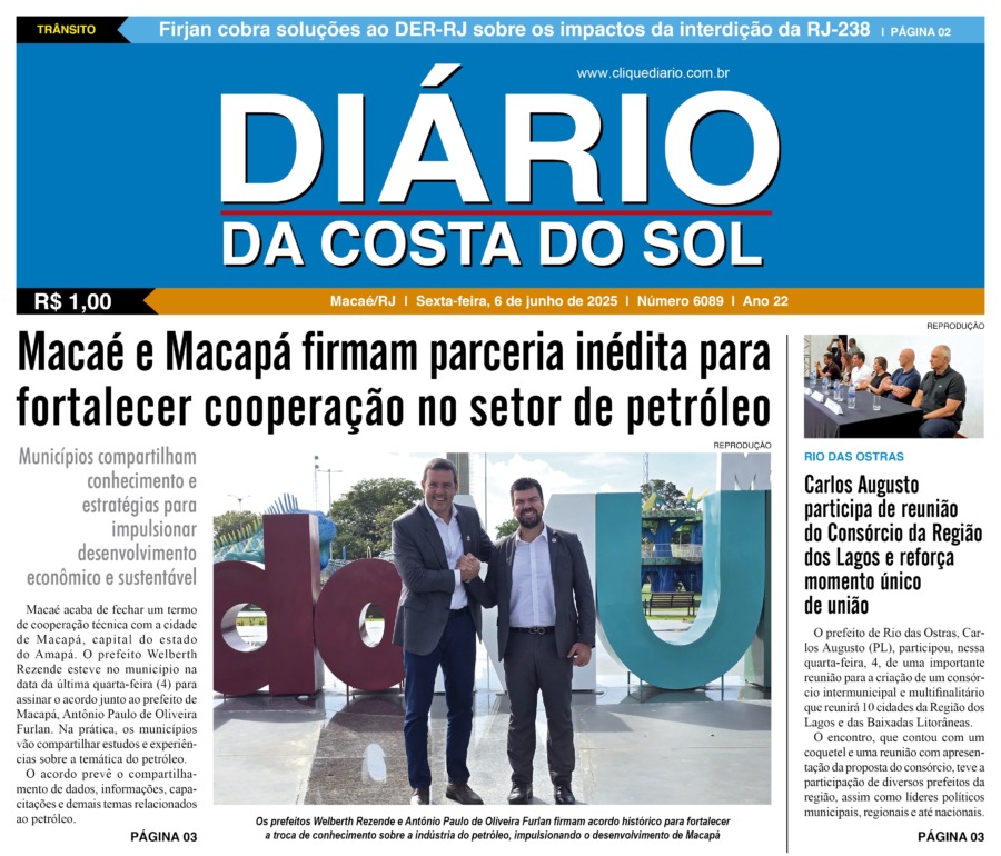 Edições Impressas Edição de sexta-feira 06/06/2025 nº 6099 Publicado em 06/06/2025 - 08:40 Escrito por Redação Notícias relacionadas: Seguinte Edição de sábado a segunda-feira 07 a 09/06/2025 nº 6100 Anterior Edição de quinta-feira 05/06/2025 nº 6098 Redação Notícias Recentes Cidades2 horas atrás Silva Jardim promove solenidade para entrega de Plano de Contingências 2025-2026 Segurança Pública3 horas atrás Prefeito de Rio das Ostras se manifesta após mais uma ação da PM contra barricadas do tráfico Polícia4 horas atrás Homem é detido por envolvimento com o tráfico durante patrulhamento na Nova Holanda, em Macaé Polícia4 horas atrás Polícia apreende grande quantidade de drogas durante operação no Nova Esperança em Macaé Polícia4 horas atrás Polícia recupera carro roubado antes mesmo do registro da ocorrência em Rio das Ostras Edições Impressas4 horas atrás Edição de quinta-feira 13/11/2025 nº 6211 Cidades4 horas atrás Macaé é finalista no Festival Internacional de Cinema Cristão com “A Paixão de Cristo” Cabo Frio21 horas atrás Reforma marca nova fase para o esporte cabo-friense e aniversário da cidade Arraial do cabo21 horas atrás Fórum de Arraial propõe novo modelo de desenvolvimento baseado nos 3Ds; Desvincular, Descarbonizar e Descontaminar Saúde21 horas atrás Saúde de Rio das Ostras promove mutirão de cirurgia pediátrica nessa semana Clique Diário E. L. Mídia Editora Ltda CNPJ: 09.298.880/0001-07 Redação: Rua Tupinambás 122 Gloria – Macaé/RJ comercial@diariocs.com (22) 2765-7353 (22) 999253130 Mais lidas da semana Meio Ambiente7 dias atrás Ações do Programa Limpa Rio seguem em vários pontos de Rio das Ostras Cidades2 dias atrás Servidores de Rio das Ostras participam de treinamento do Estado em Búzios Cidades7 dias atrás Quissamã participa do lançamento do Programa Ambiente Resiliente, do Governo do Estado Polícia1 dia atrás Farmácia é interditada e uma pessoa é presa em Rio das Ostras em operação da Polícia Federal