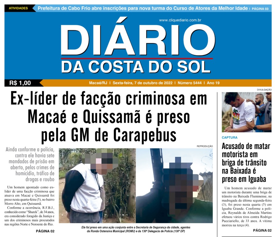 Edições Impressas Edição de sexta-feira 07/10/2022 nº 5444 Publicado em 07/10/2022 - 08:26 Escrito por Fernando Vitor Notícias relacionadas: Seguinte Edição de sábado a segunda-feira 08 a 10/10/2022 nº 5445 Anterior Edição de quinta-feira 06/10/2022 nº 5443 Fernando Vitor Notícias Recentes Cidades1 minuto atrás Unimed Costa do Sol fortalece maternidade de alta complexidade e supera índices nacionais Polícia1 hora atrás Polícia Civil de Macaé prende suspeito de tentativa de latrocínio ocorrido em 2023 Cidades1 hora atrás Macaé intensifica campanha e anuncia Dia D para doação de sangue em 29 de novembro Lazer2 horas atrás Evento marca abertura do Natal em Silva Jardim nessa quarta-feira, 19 Polícia3 horas atrás Casal é preso com grande quantidade de drogas em ação da PM em Rio das Ostras Oportunidade4 horas atrás Banco de Empregos abre semana com 660 vagas para contração imediata em Rio das Ostras Cabo Frio23 horas atrás Cabo Frio antecipa a Black Friday com grandes marcas e atrações musicais Cidades1 dia atrás Procon de Rio das Ostras investiga denúncias de cobrança dupla na Enel Cidades1 dia atrás Macaé sediará o 8º Encontro Fluminense de Arborização Urbana em dezembro Cultura2 dias atrás Teatro de Rio das Ostras recebe 2 espetáculos de dança nesse fim de semana Clique Diário E. L. Mídia Editora Ltda CNPJ: 09.298.880/0001-07 Redação: Rua Tupinambás 122 Gloria – Macaé/RJ comercial@diariocs.com (22) 2765-7353 (22) 999253130 Mais lidas da semana Cultura3 dias atrás Adilson Lopes apresenta exposição “Trajetória” em Casimiro de Abreu Cidades6 dias atrás Servidores de Rio das Ostras participam de treinamento do Estado em Búzios Polícia5 dias atrás Farmácia é interditada e uma pessoa é presa em Rio das Ostras em operação da Polícia Federal Edições Impressas5 dias atrás Edição de quarta-feira 12/11/2025 nº 6210