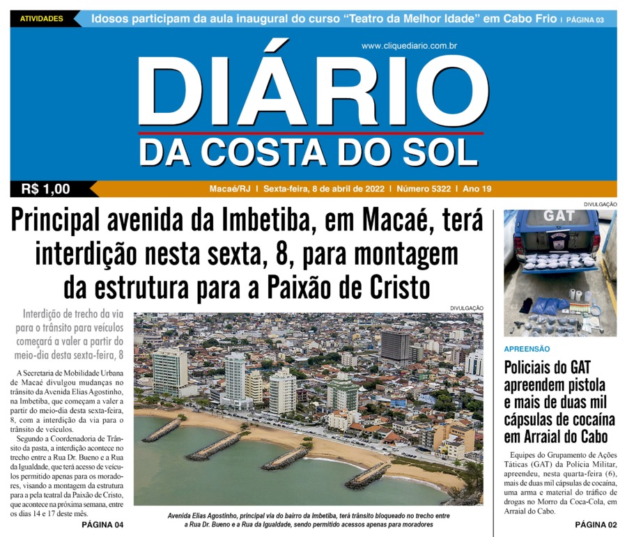 Edições Impressas Edição de sexta-feira 08/04/2022 nº 5322 Publicado em 07/04/2022 - 23:55 Escrito por Fernando Vitor Notícias relacionadas: Seguinte Edição de sábado a segunda-feira 09 a 11/04/2022 nº 5323 Anterior Edição de quinta-feira 07/04/2022 nº 5321 Fernando Vitor Notícias Recentes Cultura27 minutos atrás Moda e Prosa Caipira tem sua 6ª edição nessa quinta, 20, em Saquarema Comércio2 horas atrás Rio das Ostras tem 19ª edição de sua tradicional feira outlet nesse feriado Cidades2 horas atrás Macaé recebe 20ª edição do Prefeitura Presente no dia 25 de novembro Polícia3 horas atrás Denúncia anônima leva à prisão de duas mulheres por tráfico em Macaé Cidades3 horas atrás Caravana de Natal Coca-Cola passa por Rio das Ostras e Casimiro de Abreu nessa quinta, 20 Edições Impressas4 horas atrás Edição de quarta-feira 19/11/2025 nº 6215 Arraial do cabo20 horas atrás Educação de Arraial do Cabo orienta responsáveis sobre rematrícula para o próximo ano Cabo Frio20 horas atrás Evento comercial mais aguardado de Cabo Frio atinge 100% de estandes vendidos Saúde21 horas atrás Rio das Ostras comemora melhorias no atendimento da saúde municipal Cabo Frio21 horas atrás Nova exposição no Palácio das Águias recebe homenagem da cultura negra em Cabo Frio com 44 obras Clique Diário E. L. Mídia Editora Ltda CNPJ: 09.298.880/0001-07 Redação: Rua Tupinambás 122 Gloria – Macaé/RJ comercial@diariocs.com (22) 2765-7353 (22) 999253130 Mais lidas da semana Cultura5 dias atrás Adilson Lopes apresenta exposição “Trajetória” em Casimiro de Abreu Cidades6 dias atrás Macaé é finalista no Festival Internacional de Cinema Cristão com “A Paixão de Cristo” Meio Ambiente2 dias atrás Lagoa de Iriry, em Rio das Ostras, recebe nova sinalização focada em sustentabilidade Cidades2 dias atrás Macaé registra avanço na coleta seletiva porta a porta e recolhe mais de 2 toneladas em 45 dias