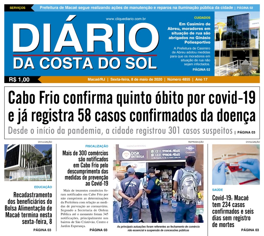Edições Impressas Edição de sexta-feira 08/05/2020 nº 4855 Publicado em 08/05/2020 - 07:00 Escrito por Fernando Vitor Notícias relacionadas: Seguinte Edição de sábado a segunda-feira 09 a 11/05/2020 nº 4856 Anterior Edição de quinta-feira 07/05/2020 nº 4854 Fernando Vitor Notícias Recentes Sem categoria4 horas atrás Arraial do Cabo cria área de convivência voltada à educação ambiental Segurança Pública4 horas atrás Prefeito de Rio das Ostras pede aumento do efetivo da PM durante o verão Cidades4 horas atrás Macaé participa do XII Congresso Brasileiro de Guardas Municipais e Segurança Pública Cidades4 horas atrás Quissamã reúne gestores das escolas de tempo integral para planejar ações de 2026 Cabo Frio5 horas atrás Cabo Frio reúne pesquisadores e gestores em evento estratégico Cultura5 horas atrás Sindicomércio anuncia Sesc Verão 2026 em Rio das Ostras e Casimiro de Abreu Cabo Frio5 horas atrás Cabo Frio: Procon cobra melhorias da Enel após sucessivas quedas de energia Arraial do cabo5 horas atrás Arraial do Cabo: Mobilização cultural marca edição do Fórum Municipal Cabo Frio5 horas atrás Cabo Frio: Guarda Municipal comemora 65 anos com estrutura reforçada Cabo Frio5 horas atrás Manhã de prevenção mobiliza Guarda Civil de Cabo Frio Clique Diário E. L. Mídia Editora Ltda CNPJ: 09.298.880/0001-07 Redação: Rua Tupinambás 122 Gloria – Macaé/RJ comercial@diariocs.com (22) 2765-7353 (22) 999253130 Mais lidas da semana Cabo Frio6 dias atrás Cabo Frio promove ação do projeto Capoeiragem para registro de documentário Cultura5 horas atrás Sindicomércio anuncia Sesc Verão 2026 em Rio das Ostras e Casimiro de Abreu Saúde1 dia atrás Rio das Ostras amplia vacinação contra HPV até dezembro para jovens até 19 anos Sem categoria1 dia atrás Arraial do Cabo inicia operação para padronizar quadriciclos e similares