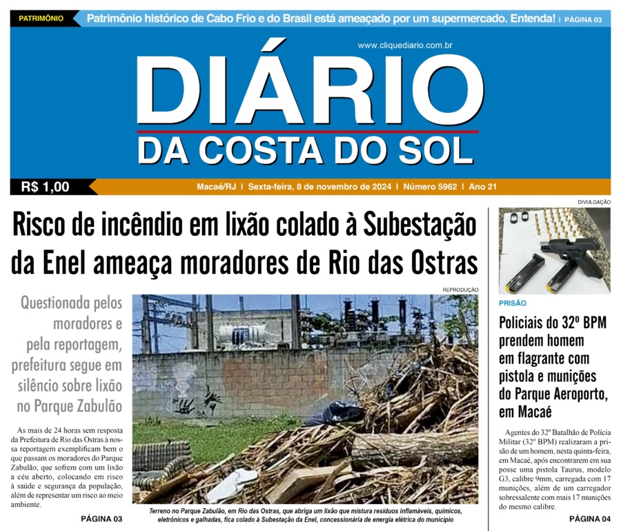 Edições Impressas Edição de sexta-feira 08/11/2024 nº 5962 Publicado em 08/11/2024 - 08:00 Escrito por Redação Notícias relacionadas: Seguinte Edição de sábado a segunda-feira 09 a 11/11/2024 nº 5963 Anterior Edição de quinta-feira 07/11/2024 nº 5961 Redação Notícias Recentes Emprego4 minutos atrás Prefeitura de Cabo Frio investe em qualificação e sustentabilidade Polícia1 hora atrás Adolescente é detida em Maricá em ação que apreendeu grande quantidade de drogas Polícia1 hora atrás Polícia apreende drogas em caixa de energia de casa em Rio das Ostras Comércio2 horas atrás Plaza Rio das Ostras anuncia chegada do Papai Noel e programação de Natal Polícia3 horas atrás Ação do GAT do 32º BPM termina com apreensão de drogas e prisão de suspeito na Aroeira, em Macaé Polícia3 horas atrás Moto roubada é recuperada em Macaé durante ação conjunta entre PM e Mobilidade Urbana Polícia3 horas atrás Polícia Militar apreende fuzil e drogas em operação na comunidade das Malvinas, em Macaé Cidades22 horas atrás Macaé lança o Jornal do Servidor no dia 12 de novembro durante congresso na Câmara Municipal Cidades1 dia atrás Prefeito de Rio das Ostras participa de evento sobre cidades inteligentes em Barcelona, na Espanha Cabo Frio2 dias atrás Estudantes de Cabo Frio brilham em premiação do projeto CaptaAção Clique Diário E. L. Mídia Editora Ltda CNPJ: 09.298.880/0001-07 Redação: Rua Tupinambás 122 Gloria – Macaé/RJ comercial@diariocs.com (22) 2765-7353 (22) 999253130 Mais lidas da semana Arraial do cabo4 dias atrás Arraial do Cabo celebra 3ª edição do Festival de Frutos do Mar com entrada livre; Carol Biazin, Ramona Rox, Liah Soares e mais Turismo7 dias atrás Saquarema celebra reconhecimento de projeto pelo Ministério do Turismo Cidades6 dias atrás HFM ganha novo Pronto-Socorro moderno e ampliado em Campos Educação6 dias atrás Estudantes de Rio das Ostras são destaques em evento nacional da Educação
