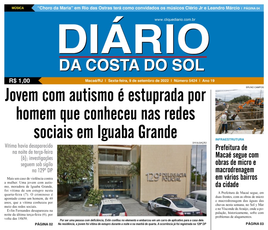 Edições Impressas Edição de sexta-feira 09/09/2022 nº 5424 Publicado em 09/09/2022 - 00:12 Escrito por Fernando Vitor Notícias relacionadas: Seguinte Edição de sábado a segunda-feira 10 a 12/09/2022 nº 5425 Anterior Edição de quarta e quinta-feira 07 e 08/09/2022 nº 5423 Fernando Vitor Notícias Recentes Arraial do cabo9 horas atrás Educação de Arraial do Cabo orienta responsáveis sobre rematrícula para o próximo ano Cabo Frio9 horas atrás Evento comercial mais aguardado de Cabo Frio atinge 100% de estandes vendidos Saúde9 horas atrás Rio das Ostras comemora melhorias no atendimento da saúde municipal Cabo Frio9 horas atrás Nova exposição no Palácio das Águias recebe homenagem da cultura negra em Cabo Frio com 44 obras Arraial do cabo10 horas atrás A FIPAC em Arraial do Cabo alerta operadores náuticos: regularizem suas embarcações Comércio10 horas atrás Sindicomércio anuncia abertura do Natal Sesc 2025 em Rio das Ostras e Casimiro de Abreu Polícia11 horas atrás Polícia apreende drogas no Lagomar após varredura motivada por denúncia Polícia11 horas atrás Operação do GAT do 32º BPM apreende drogas, dinheiro e moto sem placa na Favela da Linha Desenvolvimento11 horas atrás Silva Jardim realiza audiência pública de revisão do seu Plano de Saneamento Básico Arraial do cabo12 horas atrás O poder da natureza e da memória em telas na mostra de Fransciscone Araújo em Arraial do Cabo Clique Diário E. L. Mídia Editora Ltda CNPJ: 09.298.880/0001-07 Redação: Rua Tupinambás 122 Gloria – Macaé/RJ comercial@diariocs.com (22) 2765-7353 (22) 999253130 Mais lidas da semana Cultura5 dias atrás Adilson Lopes apresenta exposição “Trajetória” em Casimiro de Abreu Polícia7 dias atrás Farmácia é interditada e uma pessoa é presa em Rio das Ostras em operação da Polícia Federal Meio Ambiente1 dia atrás Lagoa de Iriry, em Rio das Ostras, recebe nova sinalização focada em sustentabilidade Cidades1 dia atrás Macaé registra avanço na coleta seletiva porta a porta e recolhe mais de 2 toneladas em 45 dias