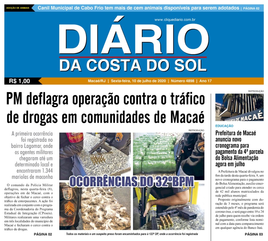 Edições Impressas Edição de sexta-feira 10/07/2020 nº 4898 Publicado em 10/07/2020 - 05:00 Escrito por Fernando Vitor Notícias relacionadas: Seguinte Edição de Sáb a Seg 11 a 13/07/2020 nº 4899 Anterior Edição de quinta-feira 09/07/2020 nº 4897 Fernando Vitor Notícias Recentes Cidades40 minutos atrás Mulheres de Saquarema participam de atividade lúdica sobre autoconhecimento Diversão1 hora atrás Silva Jardim celebra o Mês das Crianças com mais uma atividade no Centro Polícia2 horas atrás Polícia descobre esconderijo do tráfico e apreende grande quantidade de drogas em Macaé Polícia2 horas atrás Homem é preso com 105 cápsulas de cocaína em localidade de Rio das Ostras Polícia2 horas atrás Criminoso foge após perseguição e drogas são apreendidas em Macaé Polícia2 horas atrás Traficante é preso em Macaé após perseguição policial no Parque Aeroporto Polícia2 horas atrás Polícia prende suspeito e recupera carro roubado de madrugada em Rio das Ostras Cabo Frio23 horas atrás Arte e solidariedade marcam a 1ª Mostra de Dança Regional de Tamoios Cidades1 dia atrás Região serrana de Macaé recebe 1º X-Force Passeio de Quadriciclo e Aranha neste domingo (26) Polícia1 dia atrás Polícia apreende mais de meio quilo de drogas no Loteamento São João, em Rio das Ostras Clique Diário E. L. Mídia Editora Ltda CNPJ: 09.298.880/0001-07 Redação: Rua Tupinambás 122 Gloria – Macaé/RJ comercial@diariocs.com (22) 2765-7353 (22) 999253130 Mais lidas da semana Cultura7 dias atrás Silva Jardim anuncia shows gratuitos de samba e pagode para o fim de semana Edições Impressas5 dias atrás Edição de quarta-feira 22/10/2025 nº 6195 Cultura6 dias atrás Música, emoção e cores: Rodrigo Pontes apresenta show especial em Rio das Ostras Arraial do cabo7 dias atrás Prisão em flagrante marca operação da Patrulha Maria da Penha em Arraial do Cabo