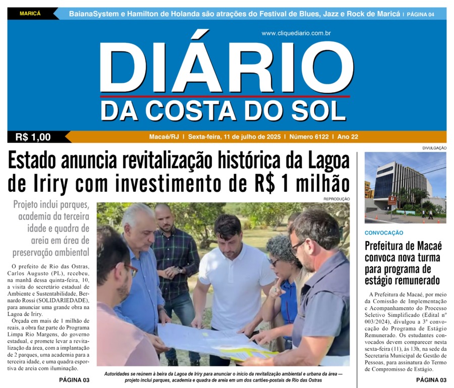 Edições Impressas Edição de sexta-feira 11/07/2025 nº 6122 Publicado em 11/07/2025 - 09:32 Escrito por Redação Notícias relacionadas: Seguinte Edição de sábado a segunda-feira 12 a 14/07/2025 nº 6123 Anterior Edição de quinta-feira 10//07/2025 nº 6121 Redação Notícias Recentes Armação dos Búzios15 minutos atrás Búzios sedia Encontro Fluminense FBHA com foco no fortalecimento do turismo regional Cultura34 minutos atrás Festival de Frutos do Mar de Rio das Ostras é lançado em evento para convidados Mobilidade1 hora atrás Acidente assusta moradores e deixa RJ-106 interditada em Saquarema Iguaba2 horas atrás Carro despenca em valão e mobiliza equipes de resgate em Iguaba Grande Cabo Frio2 horas atrás Audiência pública discute receitas e despesas previstas para Cabo Frio no próximo ano Cabo Frio2 horas atrás Contribuintes de Cabo Frio podem quitar dívidas ajudando causas sociais Cabo Frio2 horas atrás Evento religioso e cultural reúne fiéis na Semana Evangélica de Cabo Frio Cidades5 horas atrás Sana celebra 123 anos com programação cultural especial Cidades5 horas atrás Silas Andrade brilha e coloca Macaé no pódio da Copa Latino-Americana de BMX Polícia6 horas atrás Furto de celular leva a prisão de um casal em Macaé Clique Diário E. L. Mídia Editora Ltda CNPJ: 09.298.880/0001-07 Redação: Rua Tupinambás 122 Gloria – Macaé/RJ comercial@diariocs.com (22) 2765-7353 (22) 999253130 Mais lidas da semana Edições Impressas3 dias atrás Edição de sábado a segunda-feira 25 a 27/10/2025 nº 6198 Edições Impressas6 dias atrás Edição de quarta-feira 22/10/2025 nº 6195 Cidadania4 dias atrás Plano Diretor de Rio das Ostras é tema de fórum da sociedade civil nesse sábado, 25 Cabo Frio2 horas atrás Audiência pública discute receitas e despesas previstas para Cabo Frio no próximo ano