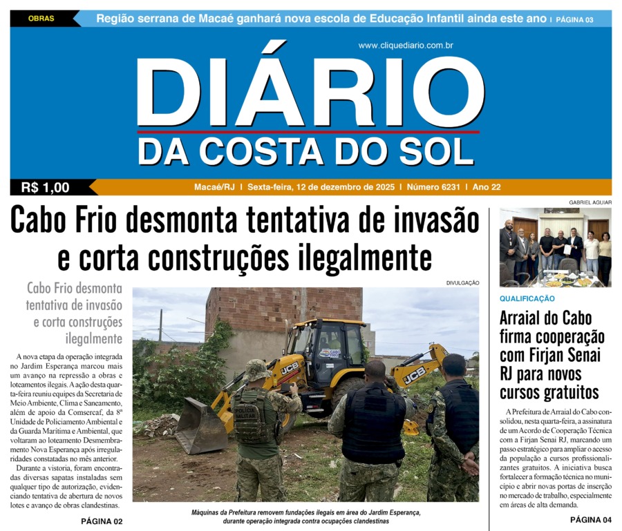 Edições Impressas Edição de sexta-feira 12/12/2025 nº 6231 Publicado em 12/12/2025 - 08:43 Escrito por Redação Notícias relacionadas: Anterior Edição de quinta-feira 11/12/2025 nº 6230 Redação Notícias Recentes Polícia6 minutos atrás Homem é preso por tráfico durante operação na Favela da Linha, em Macaé Edições Impressas1 hora atrás Edição de sexta-feira 12/12/2025 nº 6231 Arraial do cabo16 horas atrás Arraial do Cabo fortalece políticas culturais com novo prêmio Arraial do cabo16 horas atrás Arraial do Cabo celebra fim de ano com show de Liah Soares na Feira do Xaréu Arraial do cabo17 horas atrás Arraial do Cabo fortalece laços com pesquisadores da Uerj Arraial do cabo17 horas atrás Arraial do Cabo avança em políticas de capacitação com apoio da Firjan Senai RJ Cidades17 horas atrás Região serrana de Macaé ganhará nova escola de Educação Infantil ainda este ano Cabo Frio17 horas atrás Cabo Frio amplia procura por vagas e Emprego Já atinge melhor desempenho do trimestre Cidades17 horas atrás Prefeito de Rio das Ostras se reúne com médicos para discutir melhorias na saúde Arraial do cabo20 horas atrás Arraial do Cabo fortalece RPPS com primeira compensação previdenciária do INSS Clique Diário E. L. Mídia Editora Ltda CNPJ: 09.298.880/0001-07 Redação: Rua Tupinambás 122 Gloria – Macaé/RJ comercial@diariocs.com (22) 2765-7353 (22) 999253130 Mais lidas da semana Cidades2 dias atrás Moto com sinais de adulteração é retirada de circulação no Parque Aeroporto Cidades3 dias atrás Corpo é encontrado na Praia da Imbetiba e polícia investiga o caso em Macaé Política3 dias atrás Proposta de Alan Mansur busca consolidar Macaé como modelo regional em sustentabilidade Polícia22 horas atrás Homem que ameaça pessoas com faca e martelo acaba morto em Campos