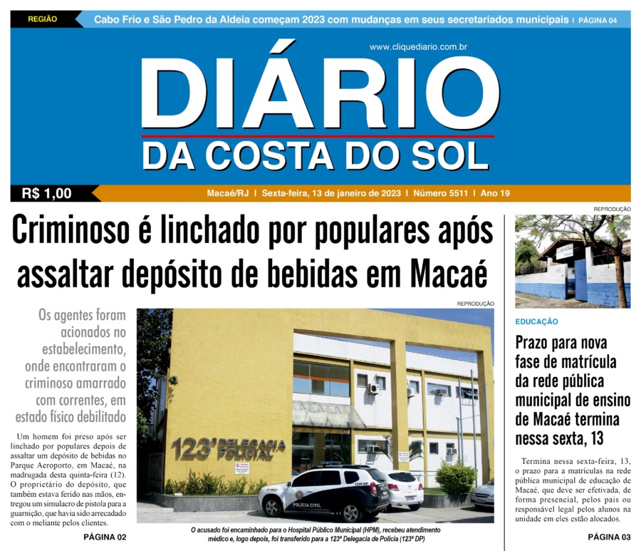 Edições Impressas Edição de sexta-feira 13/01/2023 nº 5511 Publicado em 13/01/2023 - 00:00 Escrito por Redação Notícias relacionadas: Seguinte Edição de sábado a segunda-feira 14 a 16/01/2023 nº 5512 Anterior Edição de quinta-feira 12/01/2023 nº 5510 Redação Notícias Recentes Cabo Frio18 horas atrás Arte e solidariedade marcam a 1ª Mostra de Dança Regional de Tamoios Cidades23 horas atrás Região serrana de Macaé recebe 1º X-Force Passeio de Quadriciclo e Aranha neste domingo (26) Polícia23 horas atrás Polícia apreende mais de meio quilo de drogas no Loteamento São João, em Rio das Ostras Saúde2 dias atrás Eventos esportivo e cultural reforça campanha do Outubro Rosa em Rio das Ostras nesse domingo, 26 Edições Impressas2 dias atrás Sábado a segunda-feira 25 a 27/10/2025 nº 6197 Cidades2 dias atrás Shopping Plaza Macaé oferece programação gratuita com feira de adoção e show de pagode neste fim de semana Cidades3 dias atrás 32º BPM completa 23 anos com solenidade de celebração e reconhecimento aos policiais Armação dos Búzios3 dias atrás Búzios celebra esporte e superação com XC RUN 2025 Araruama3 dias atrás Araruama promove saúde, lazer e cidadania em evento comunitário Arraial do cabo3 dias atrás Educação e sustentabilidade se encontram para jovens de Arraial do Cabo Clique Diário E. L. Mídia Editora Ltda CNPJ: 09.298.880/0001-07 Redação: Rua Tupinambás 122 Gloria – Macaé/RJ comercial@diariocs.com (22) 2765-7353 (22) 999253130 Mais lidas da semana Cultura7 dias atrás Silva Jardim anuncia shows gratuitos de samba e pagode para o fim de semana Cultura6 dias atrás Música, emoção e cores: Rodrigo Pontes apresenta show especial em Rio das Ostras Polícia7 dias atrás Policiais da PRF salvam bebê engasgado na BR-101, em Campos Cabo Frio7 dias atrás Atletas de várias cidades se enfrentam em competição de Muay Thai em Cabo Frio
