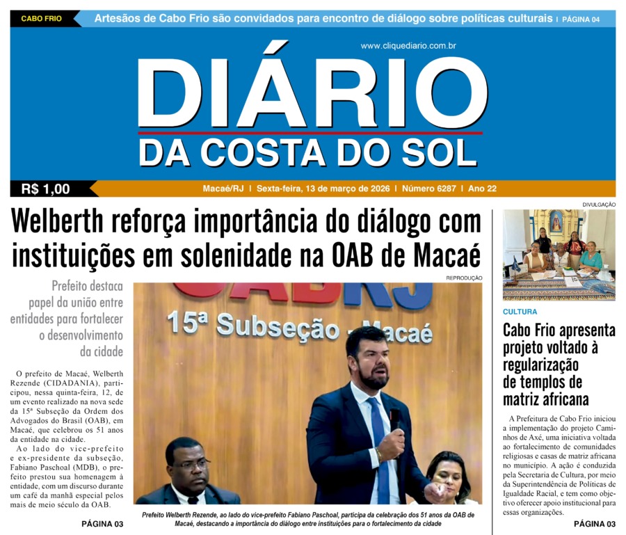 Edições Impressas Edição de sexta-feira 13/03/2026 nº 6287 Publicado em 13/03/2026 - 09:39 Escrito por Redação Notícias relacionadas: Anterior Edição de quinta-feira 12/03/2026 nº 6286 Redação Notícias Recentes Edições Impressas27 segundos atrás Edição de sexta-feira 13/03/2026 nº 6287 Araruama16 horas atrás Ampliação de posto de saúde vai reforçar atendimento em bairros de Araruama Arraial do cabo17 horas atrás Aniversário de Arraial do Cabo deve reunir artistas nacionais em quatro dias de festa Arraial do cabo17 horas atrás Candidatos realizam provas do concurso da Prefeitura de Arraial do Cabo neste domingo Cabo Frio17 horas atrás Cabo Frio amplia mobilização para prevenir dengue e outras doenças transmitidas pelo mosquito Cabo Frio17 horas atrás Prefeitura de Cabo Frio abre espaço de debate para o setor de artesanato Tecnologia17 horas atrás Evento em Rio das Ostras discute conectividade, tecnologia e inovação na gestão pública Cidades18 horas atrás Cuidado com servidores é destaque de serviço oferecido pela prefeitura em Macaé Cidades19 horas atrás Welberth reforça importância do diálogo com instituições em solenidade na OAB de Macaé Arraial do cabo20 horas atrás Arraial do Cabo reforça rede de proteção à infância com atuação integrada entre secretarias Clique Diário E. L. Mídia Editora Ltda CNPJ: 09.298.880/0001-07 Redação: Rua Tupinambás 122 Gloria – Macaé/RJ comercial@diariocs.com (22) 2765-7353 (22) 999253130 Mais lidas da semana Infraestrutura3 dias atrás Arteris assina aditivo e promete investimentos de R$ 6,2 bilhões na BR-101 Edições Impressas6 dias atrás Edição de sábado a segunda-feira 07 a 09/03/2026 nº 6283 Edições Impressas1 dia atrás Edição de quinta-feira 12/03/2026 nº 6286 Infraestrutura3 dias atrás Presidente da Cedae promete reduzir pela metade tempo das obras em bairro de Macaé