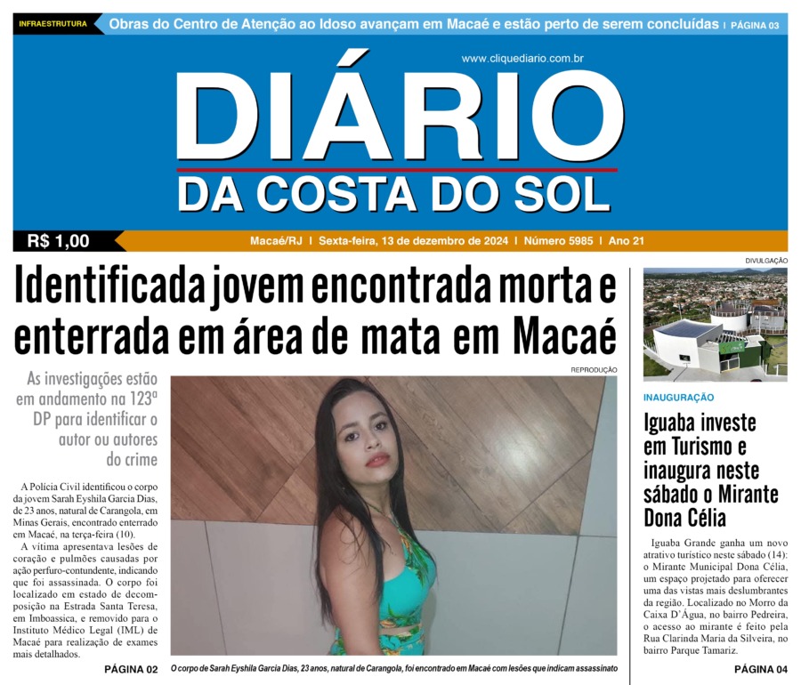 Edições Impressas Edição de sexta-feira 13/12/2024 n° 5985 Publicado em 13/12/2024 - 08:15 Escrito por Redação Notícias relacionadas: Seguinte Edição de sábado a segunda-feira 14 a 16/12/2024 nº 5986 Anterior Edição de quinta-feira 12/12/2024 nº 5984 Redação Notícias Recentes Iguaba9 horas atrás Menina de Iguaba Grande realiza sonho e conhece o príncipe William no Rio de Janeiro Arraial do cabo9 horas atrás Arraial do Cabo é exemplo de tranquilidade na Região dos Lagos, segundo dados do ISP Arraial do cabo9 horas atrás Festival em Arraial do Cabo promete recorde de público com mais de 15 mil pratos e 10 mil litros de chope Arraial do cabo9 horas atrás Oficina une saúde, cidadania e acolhimento em Arraial do Cabo Arraial do cabo9 horas atrás Sucesso de público marca o primeiro dia da Arraial Expo XP Cabo Frio9 horas atrás Prefeitura de Cabo Frio premia autoras com experiências culturais e incentivo à leitura Cidades10 horas atrás Macaé realiza audiência pública do Projeto Macaé +20 no dia 10 de dezembro Polícia10 horas atrás Polícia Militar recupera celulares roubados após série de assaltos em Campos Educação10 horas atrás Mostra cultural do CIEP Mestre Marçal lota o Teatro de Rio das Ostras Polícia11 horas atrás Polícia prende 3 homens envolvidos com o tráfico em Rio das Ostras Clique Diário E. L. Mídia Editora Ltda CNPJ: 09.298.880/0001-07 Redação: Rua Tupinambás 122 Gloria – Macaé/RJ comercial@diariocs.com (22) 2765-7353 (22) 999253130 Mais lidas da semana Arraial do cabo2 dias atrás Arraial do Cabo celebra 3ª edição do Festival de Frutos do Mar com entrada livre; Carol Biazin, Ramona Rox, Liah Soares e mais Cidades3 dias atrás HFM ganha novo Pronto-Socorro moderno e ampliado em Campos Polícia5 dias atrás Homem é preso em Maricá depois de matar uma pessoa a facadas nessa madrugada Meio Ambiente2 dias atrás Programa do governo estadual promove limpeza de rio no Âncora, em Rio das Ostras