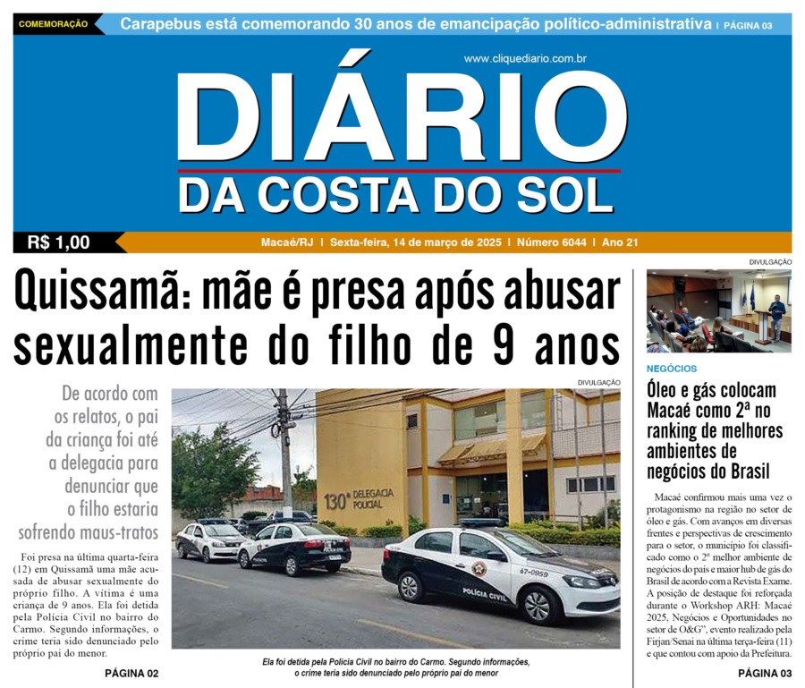 Edições Impressas Edição de sexta-feira 14/03/2025 nº 6044 Publicado em 14/03/2025 - 08:21 Escrito por Redação Notícias relacionadas: Seguinte Edição de sábado a segunda-feira 15 a 17/03/2025 nº 6045 Anterior Edição de quinta-feira 13/03/2025 nº 6043 Redação Notícias Recentes Cabo Frio11 minutos atrás Forças de segurança intensificam combate ao tráfico e prendem dupla de Cabo Frio Infraestrutura19 minutos atrás Equipes de serviços públicos segue atuando em vários pontos de Rio das Ostras Arraial do cabo23 minutos atrás Educação, inovação e meio ambiente se encontram na Arraial EXPO XP 2024 Cidades24 minutos atrás Quissamã realiza entrega de certificados a visitadoras do Programa Criança Feliz Polícia36 minutos atrás Foragido da Justiça é preso pela PM durante operação em Macaé Cultura40 minutos atrás Nova temporada do Rio das Ostras Instrumental apresenta show de Nico Rezende Arraial do cabo1 hora atrás Prefeitura de Arraial distribui guia com pratos e harmonizações do Festival de Gastronomia e Chopp Cabo Frio1 hora atrás Cabo Frio lança ação para formalizar e valorizar catadores do Braga Cidades2 horas atrás Feira do Produtor Rural terá 4ª edição nesse sábado, 1º de novembro, em Saquarema Cabo Frio2 horas atrás Cursos gratuitos da Escola de Gestão em Cabo Frio lotam e ganham novas turmas Clique Diário E. L. Mídia Editora Ltda CNPJ: 09.298.880/0001-07 Redação: Rua Tupinambás 122 Gloria – Macaé/RJ comercial@diariocs.com (22) 2765-7353 (22) 999253130 Mais lidas da semana Edições Impressas6 dias atrás Edição de sábado a segunda-feira 25 a 27/10/2025 nº 6198 Cultura2 dias atrás Prédio da Onda, em Rio das Ostras, recebe oficina teatral gratuita a partir dessa quinta, 30 Mobilidade5 horas atrás Rio das Ostras intensifica ações de combate a irregularidades no trânsito Educação5 horas atrás Cerimônia no Teatro fecha o 2º Prêmio Literário do Ensino Fundamental de Rio das Ostras