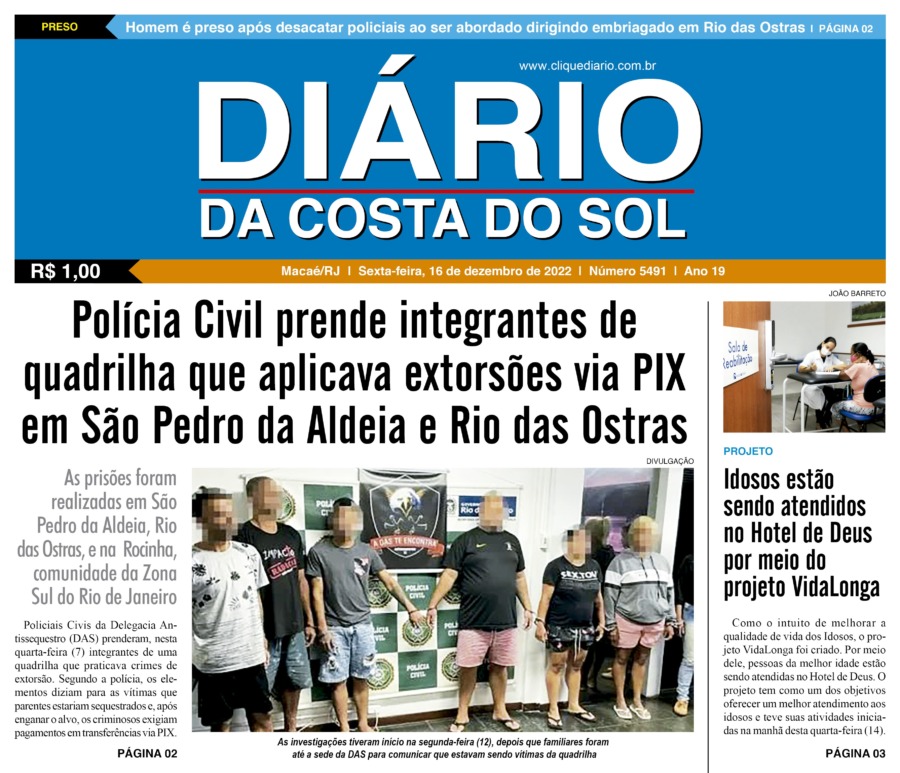 Edições Impressas Edição de sexta-feira 16/12/2022 nº 5491 Publicado em 16/12/2022 - 06:37 Escrito por Redação Notícias relacionadas: Seguinte Edição de sábado a segunda-feira 17 a 19/12/2022 nº 5492 Anterior Edição de quinta-feira 15/12/2022 nº 5490 Redação Notícias Recentes Meio Ambiente2 minutos atrás Fiscalização encontra 6 ligações clandestinas de esgoto em Rio das Ostras Cabo Frio8 minutos atrás Cabo Frio tem nova atuação da Patrulha Maria da Penha durante os 21 Dias de Ativismo Cabo Frio11 minutos atrás Cabo Frio participa do Tomorrow Blue Economy e reforça pautas ambientais Cabo Frio26 minutos atrás Cabo Frio participa de debate técnico sobre nova legislação tributária Cultura42 minutos atrás Maricá recebe grandes nomes da música no Festival Somos Latinos Cabo Frio2 horas atrás Cabo Frio amplia presença da Guarda Civil com regime adicional remunerado Cabo Frio2 horas atrás Cabo Frio amplia oportunidades com crescimento do Emprego Já Cabo Frio2 horas atrás Cabo Frio reúne especialistas para debater enfrentamento à violência Cabo Frio2 horas atrás Cabo Frio celebra força e memória no lançamento da Revista Mulheres Negras 2025 Turismo3 horas atrás Silva Jardim marca presença em evento de turismo do governo federal Clique Diário E. L. Mídia Editora Ltda CNPJ: 09.298.880/0001-07 Redação: Rua Tupinambás 122 Gloria – Macaé/RJ comercial@diariocs.com (22) 2765-7353 (22) 999253130 Mais lidas da semana Cabo Frio1 dia atrás Cabo Frio: Guarda Municipal comemora 65 anos com estrutura reforçada Política1 dia atrás Rio das Ostras entrega honraria para secretária estadual de Cultura e Economia Criativa Polícia6 horas atrás Homem é preso com drogas em ação da PM no Âncora, em Rio das Ostras Cultura24 horas atrás Sindicomércio anuncia Sesc Verão 2026 em Rio das Ostras e Casimiro de Abreu