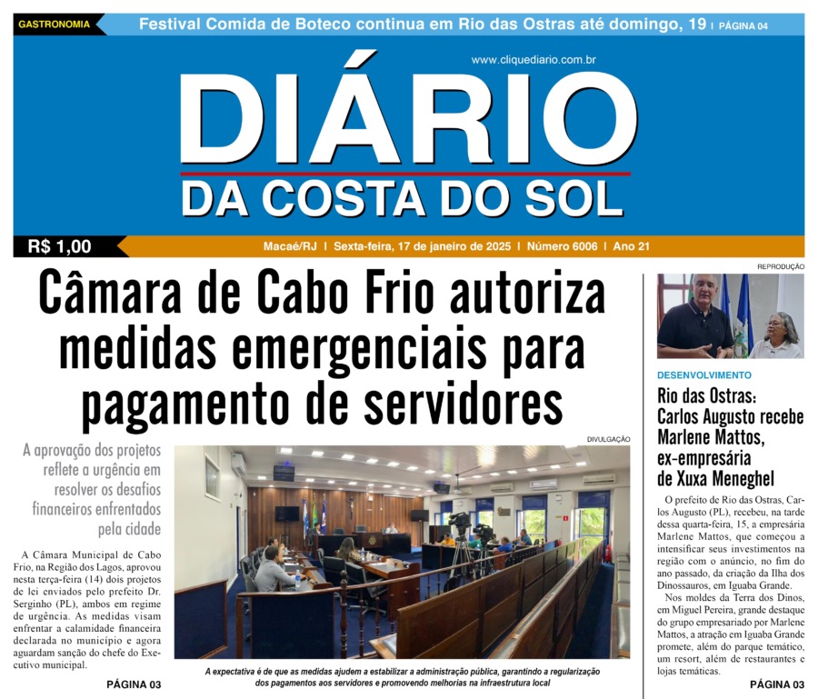 Edições Impressas Edição de sexta-feira 17/01/2025 nº 6006 Publicado em 17/01/2025 - 08:07 Escrito por Redação Notícias relacionadas: Seguinte Edição de sábado a segunda-feira 18 a 20/01/2025 nº 6007 Anterior Edição de quinta-feira 16/01/2025 nº 6005 Redação Notícias Recentes Cabo Frio4 horas atrás Agentes de Cabo Frio recebem novo treinamento técnico para atuar em casos de poluição sonora Cabo Frio5 horas atrás Homem procurado por latrocínio é detido por agentes em Cabo Frio Cabo Frio5 horas atrás Representante da Guarda Civil de Cabo Frio compete na etapa final ao lado de jovens atletas Polícia5 horas atrás Prefeito de Rio das Ostras volta de Brasília com esperança de novos investimentos Cidades5 horas atrás Campos publica 8ª convocação e chama 374 professores substitutos para a rede municipal Esporte5 horas atrás De Saquarema para o Brasileirão: Vasco troca gramado de São Januário Cidades5 horas atrás Quissamã inicia planejamento educacional para 2026 com foco em Educação Financeira Polícia8 horas atrás Mulher é presa na RJ-106, em Saquarema, com R$ 38 mil em drogas e arma Saúde9 horas atrás Silva Jardim tem aulão em alusão à campanha mundial do Novembro Azul Mobilidade10 horas atrás Mobilidade promove fiscalização para verificar situação de táxis em Rio das Ostras Clique Diário E. L. Mídia Editora Ltda CNPJ: 09.298.880/0001-07 Redação: Rua Tupinambás 122 Gloria – Macaé/RJ comercial@diariocs.com (22) 2765-7353 (22) 999253130 Mais lidas da semana Cultura10 horas atrás Adilson Lopes apresenta exposição “Trajetória” em Casimiro de Abreu Cidades3 dias atrás Servidores de Rio das Ostras participam de treinamento do Estado em Búzios Polícia2 dias atrás Farmácia é interditada e uma pessoa é presa em Rio das Ostras em operação da Polícia Federal Cidades2 dias atrás Vereadores de Macaé vão embarcar nesta quinta para participar da COP 30 em Belém
