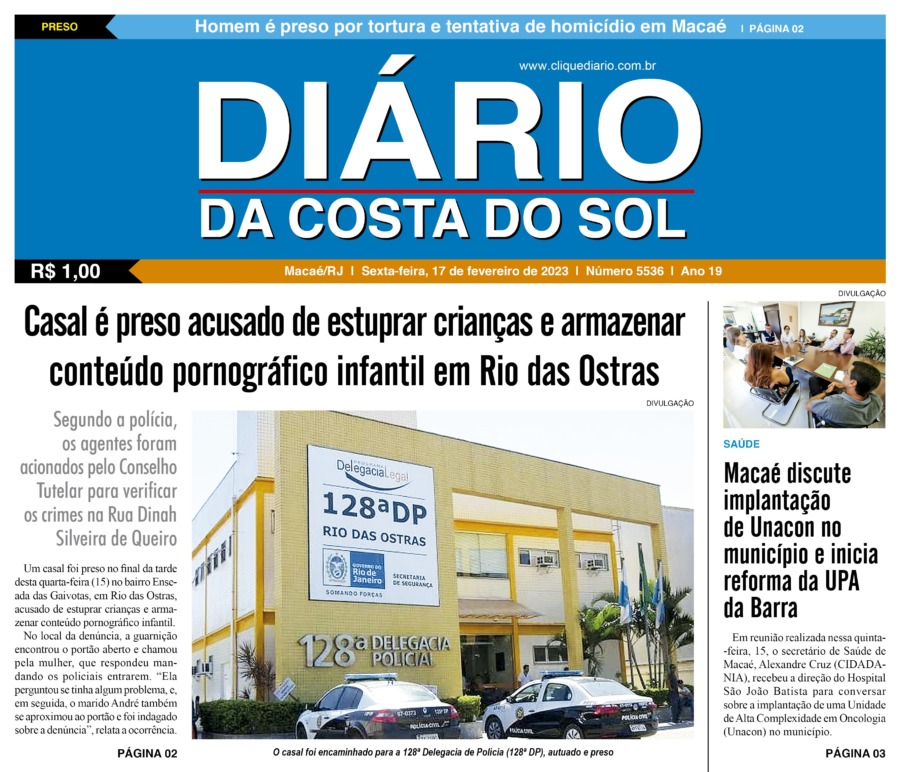 Edições Impressas Edição de sexta-feira 17/02/2023 nº 5536 Publicado em 17/02/2023 - 00:00 Escrito por Redação Notícias relacionadas: Seguinte Edição de sábado a quarta-feira 18 a 22/02/2023 nº 5537 Anterior Edição de quinta-feira 16/02/2023 nº 5535 Redação Notícias Recentes Cidades3 horas atrás Região serrana de Macaé recebe 1º X-Force Passeio de Quadriciclo e Aranha neste domingo (26) Polícia3 horas atrás Polícia apreende mais de meio quilo de drogas no Loteamento São João, em Rio das Ostras Saúde22 horas atrás Eventos esportivo e cultural reforça campanha do Outubro Rosa em Rio das Ostras nesse domingo, 26 Edições Impressas1 dia atrás Sábado a segunda-feira 25 a 27/10/2025 nº 6197 Cidades1 dia atrás Shopping Plaza Macaé oferece programação gratuita com feira de adoção e show de pagode neste fim de semana Cidades2 dias atrás 32º BPM completa 23 anos com solenidade de celebração e reconhecimento aos policiais Armação dos Búzios2 dias atrás Búzios celebra esporte e superação com XC RUN 2025 Araruama2 dias atrás Araruama promove saúde, lazer e cidadania em evento comunitário Arraial do cabo2 dias atrás Educação e sustentabilidade se encontram para jovens de Arraial do Cabo Cidades2 dias atrás Quissamã avança na reformulação do Currículo Municipal de Educação Clique Diário E. L. Mídia Editora Ltda CNPJ: 09.298.880/0001-07 Redação: Rua Tupinambás 122 Gloria – Macaé/RJ comercial@diariocs.com (22) 2765-7353 (22) 999253130 Mais lidas da semana Cultura6 dias atrás Silva Jardim anuncia shows gratuitos de samba e pagode para o fim de semana Cultura5 dias atrás Música, emoção e cores: Rodrigo Pontes apresenta show especial em Rio das Ostras Cabo Frio6 dias atrás Atletas de várias cidades se enfrentam em competição de Muay Thai em Cabo Frio Edições Impressas4 dias atrás Edição de quarta-feira 22/10/2025 nº 6195